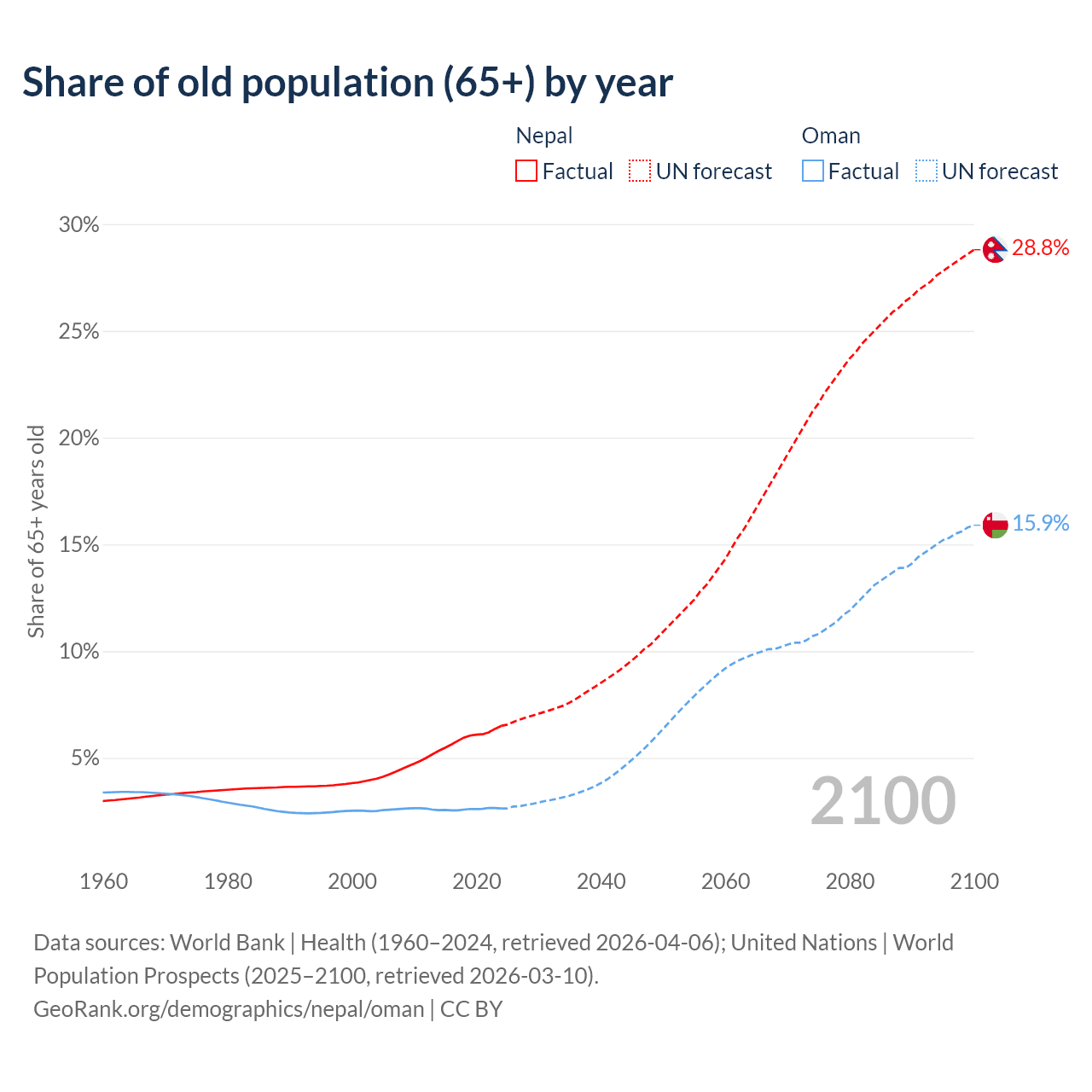 The share of older people aged 65 and over is 6.5% in Nepal and 2.64% in Oman. Life expectancy in Nepal compared to Oman .