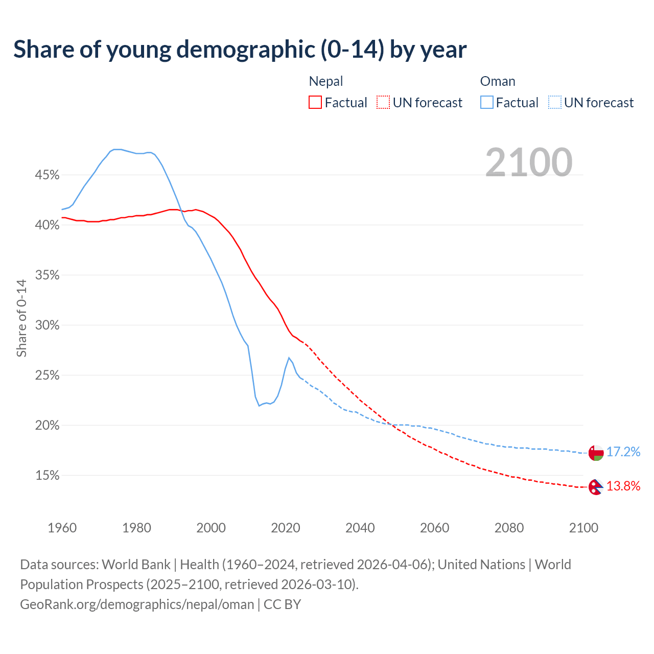- The share of young demographic (0-15 years old) in Nepal is 28.4% vs 24.7% in Oman.