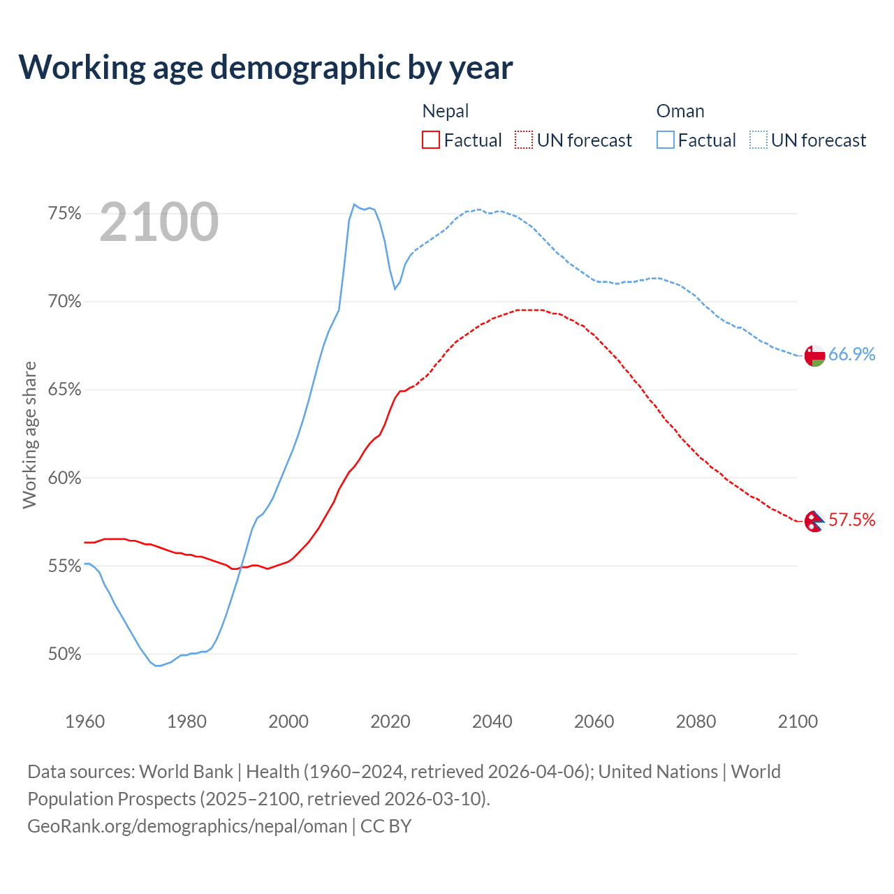 - As of 2026, the population of Nepal is 29.6M vs 5.76M in Oman - 5.14 times difference.