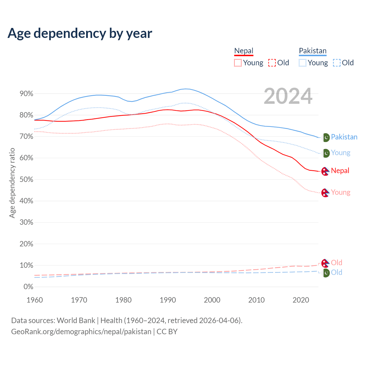 - Nepal is ranked 127/196 by median age (oldest to youngest) vs 154/196 for Pakistan.