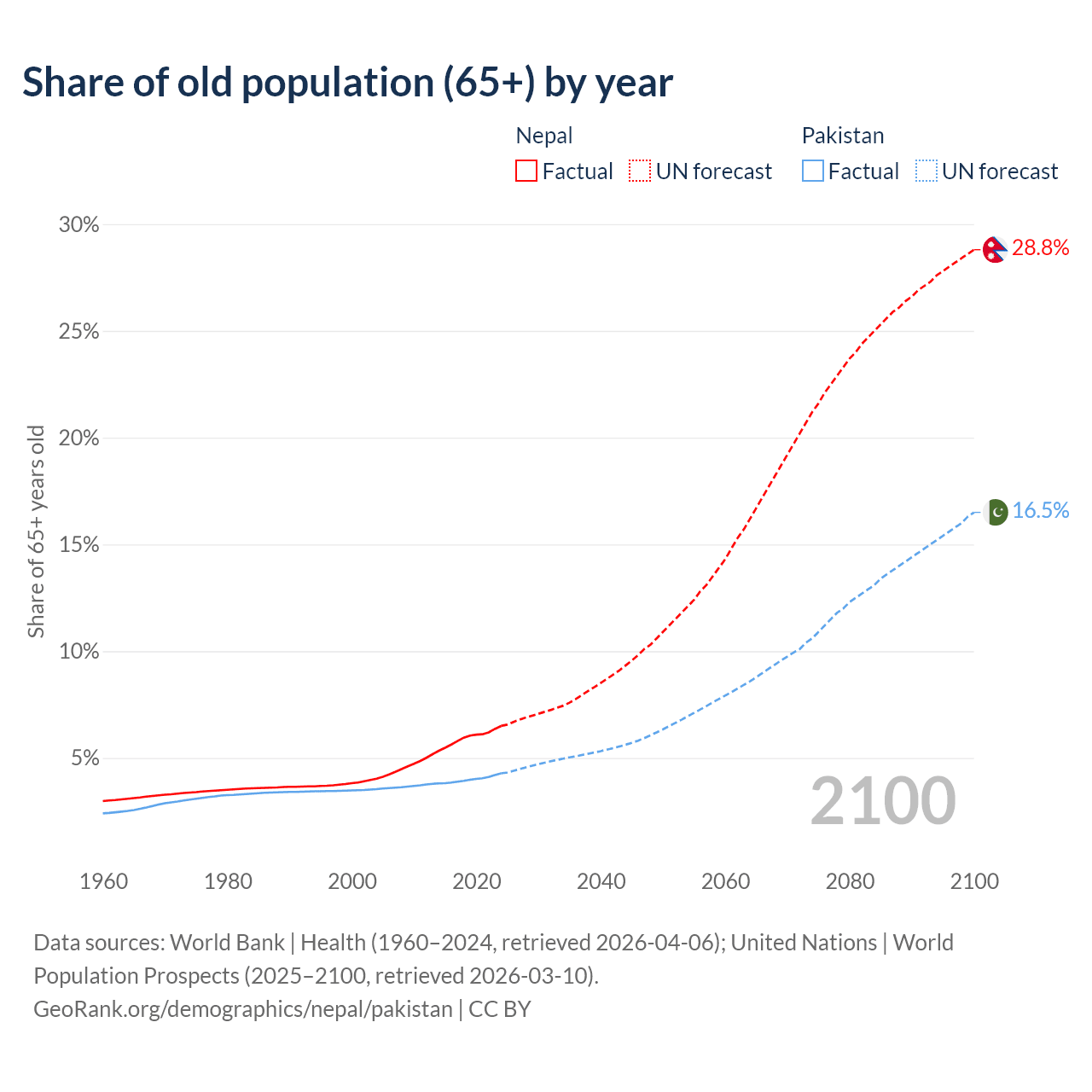 The share of older people aged 65 and over is 6.5% in Nepal and 4.28% in Pakistan. Life expectancy in Nepal compared to Pakistan .