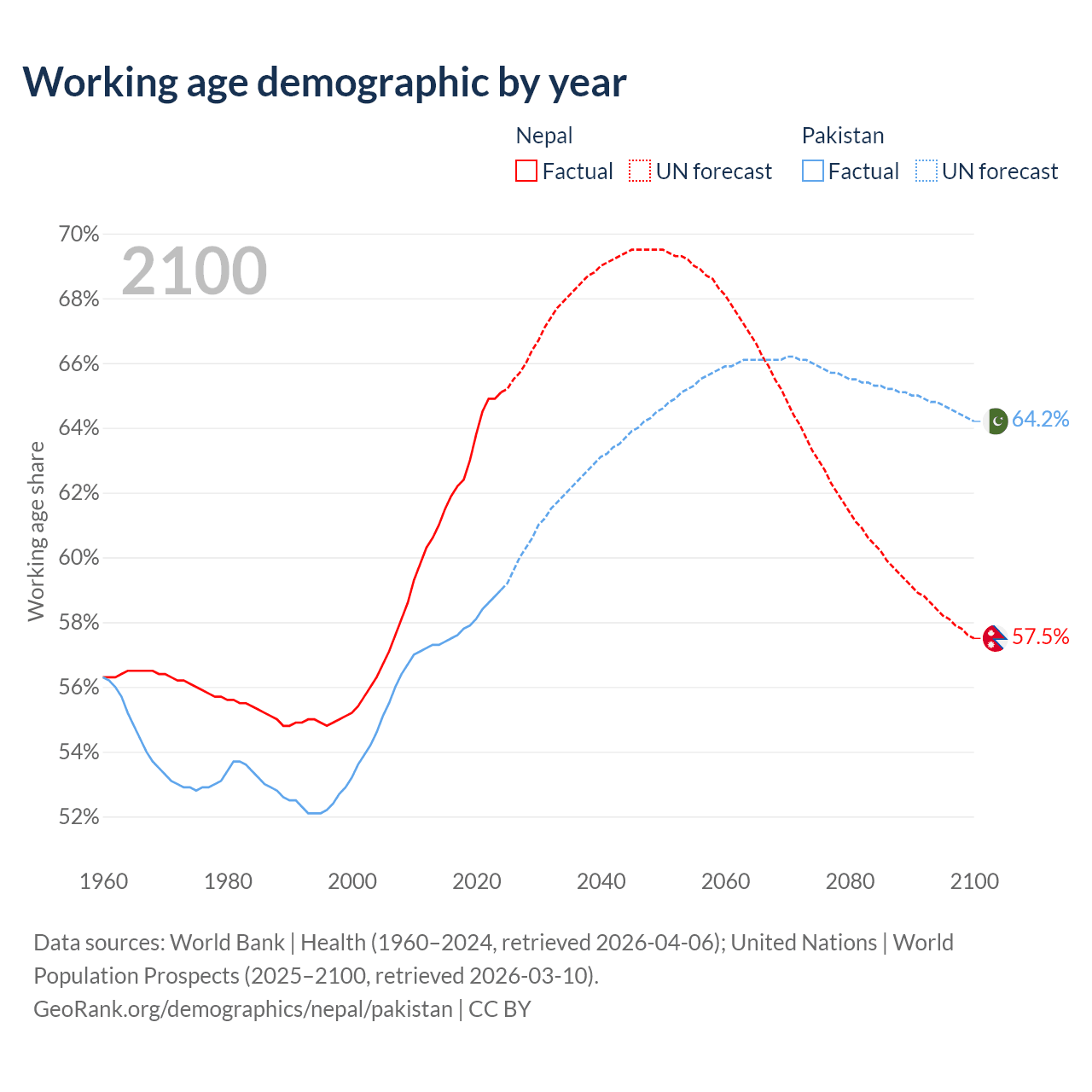 - Nepal has 19.3M working age adults (aged 15-64) vs 154M in Pakistan.