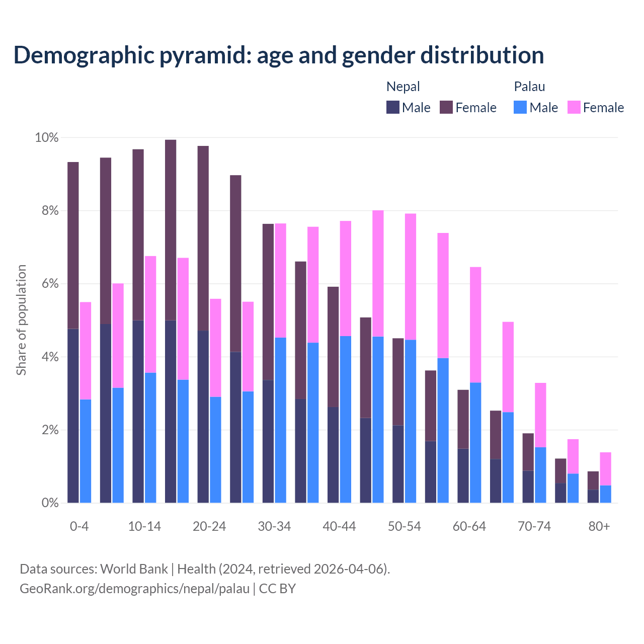 - As of 2026, the population of Nepal is 29.6M vs 17.6K in Palau - 1,679 times difference.