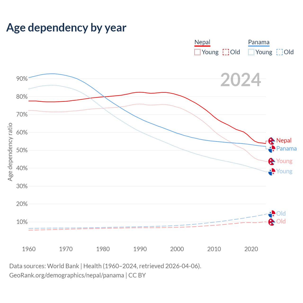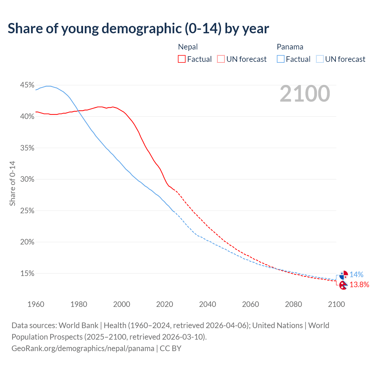 - The share of young demographic (0-15 years old) in Nepal is 28.4% vs 24.9% in Panama.