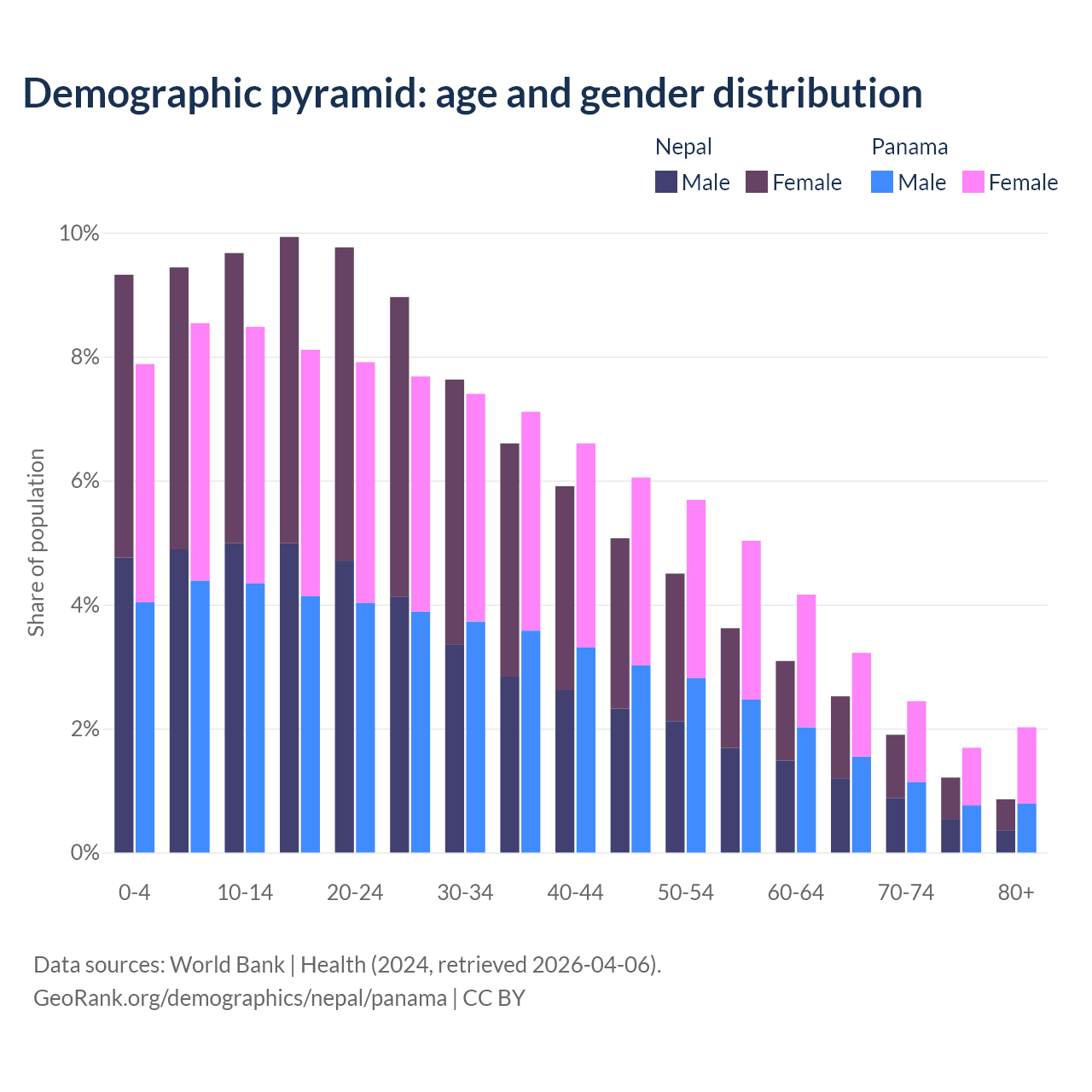 - Nepal is ranked 127/196 by median age (oldest to youngest) vs 94/196 for Panama.