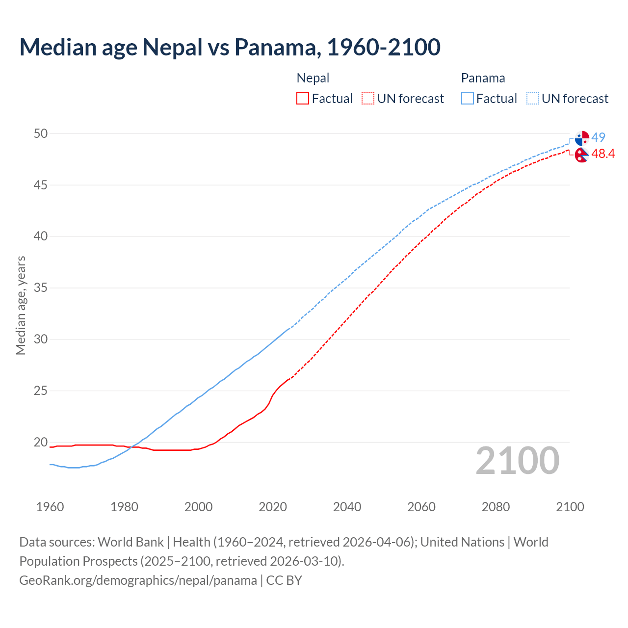 - The median age in Nepal is 26 years compared to 30.9 years in Panama.