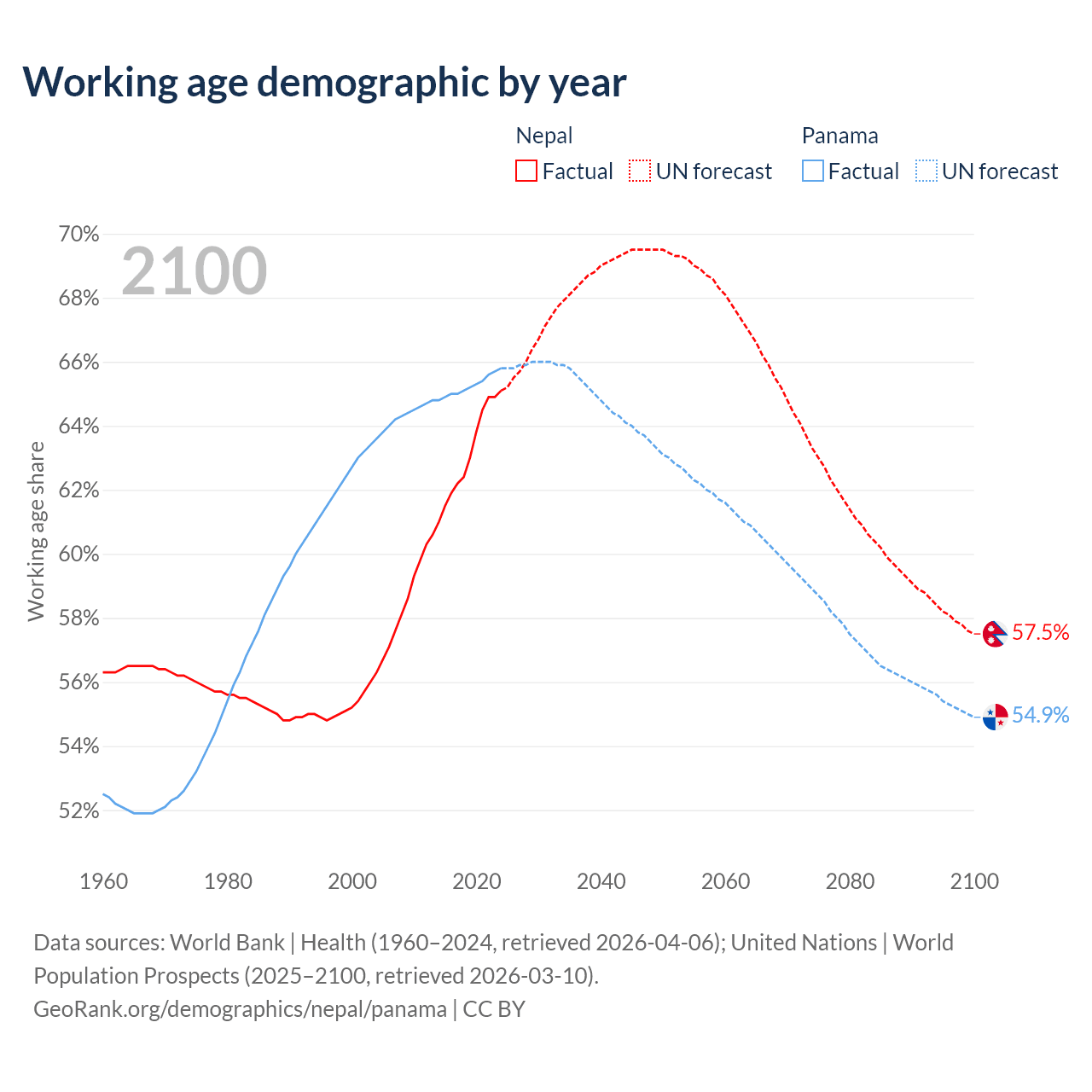 - Nepal has 19.3M working age adults (aged 15-64) vs 3.05M in Panama.