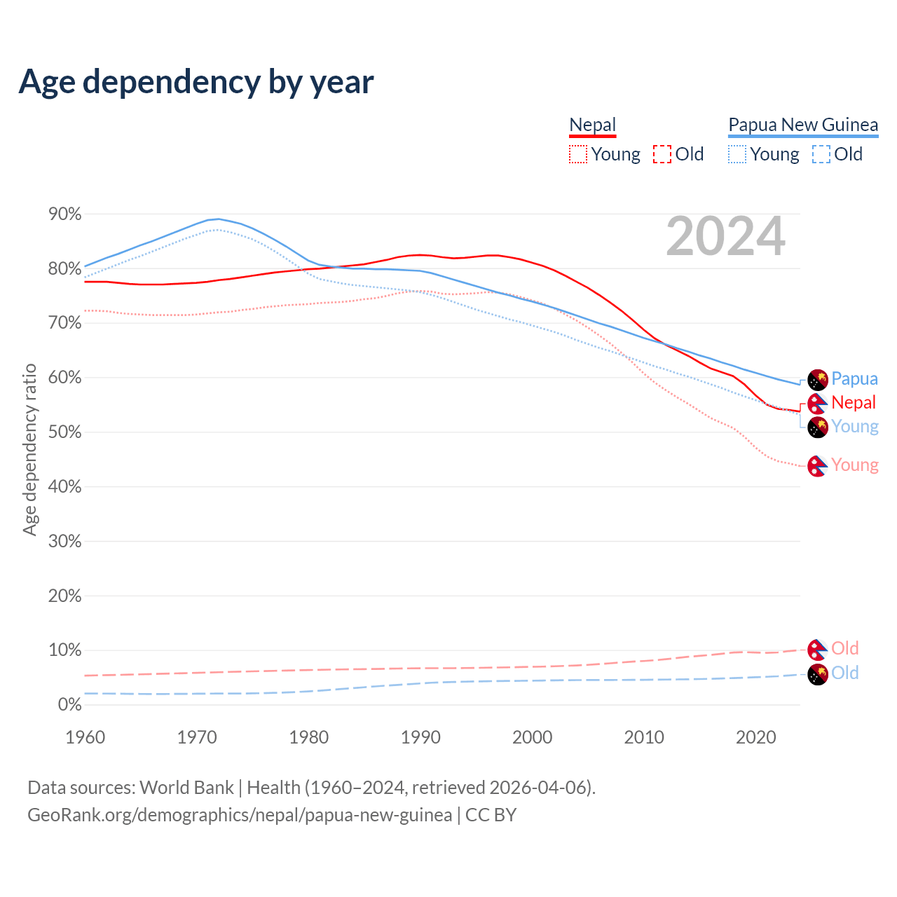 - Nepal is ranked 127/196 by median age (oldest to youngest) vs 140/196 for Papua New Guinea.