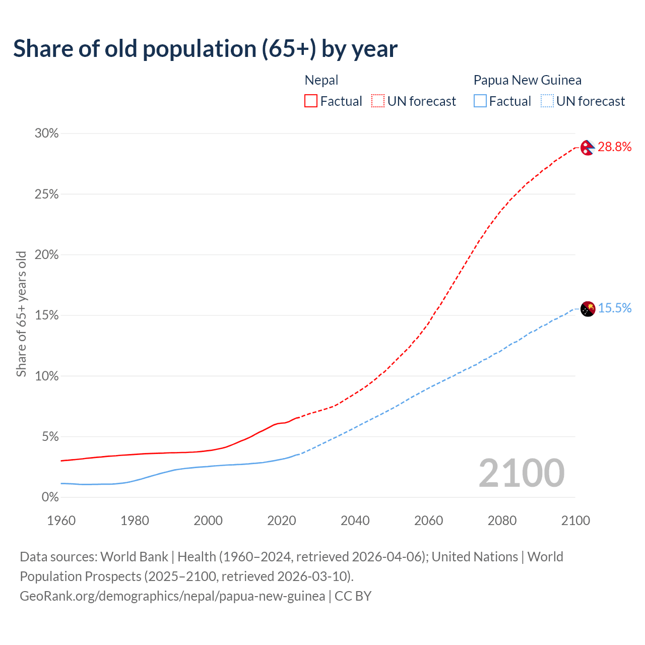 The share of older people aged 65 and over is 6.5% in Nepal and 3.46% in Papua New Guinea. Life expectancy in Nepal compared to Papua New Guinea .