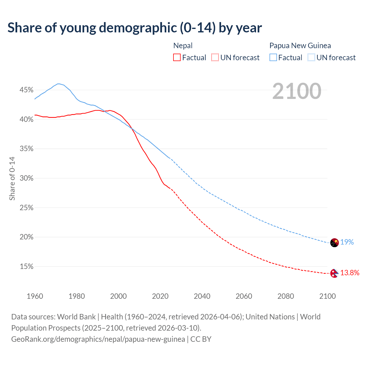 - The share of young demographic (0-15 years old) in Nepal is 28.4% vs 33.5% in Papua New Guinea.
