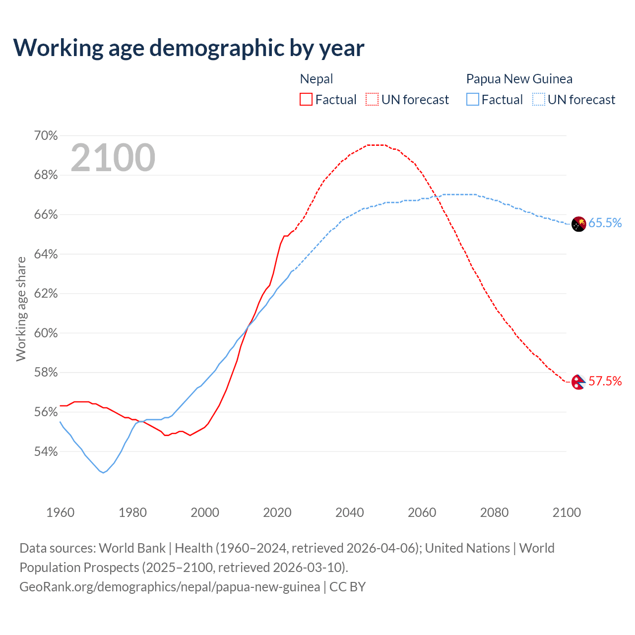 - Nepal has 19.3M working age adults (aged 15-64) vs 6.94M in Papua New Guinea.