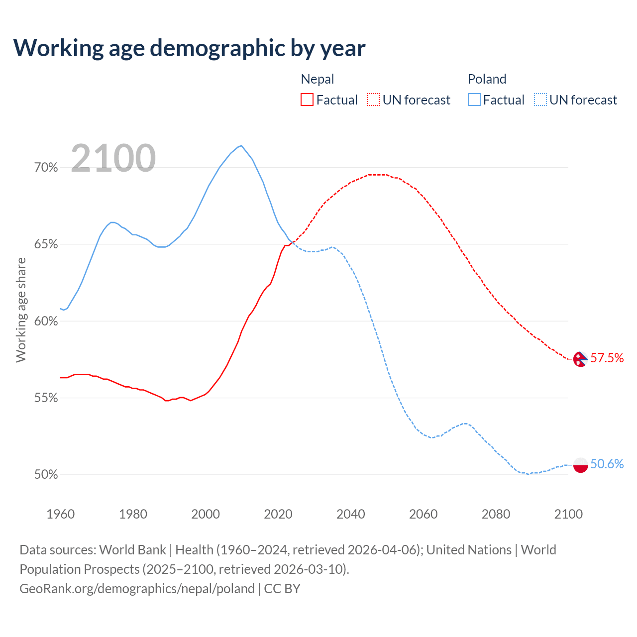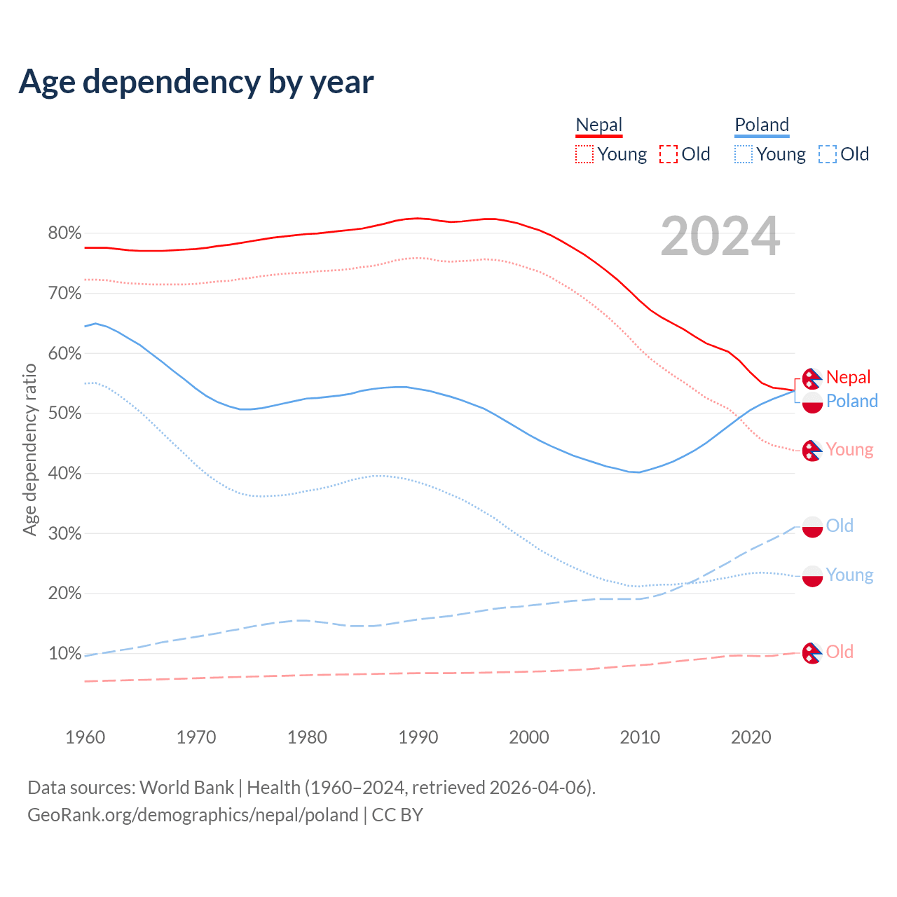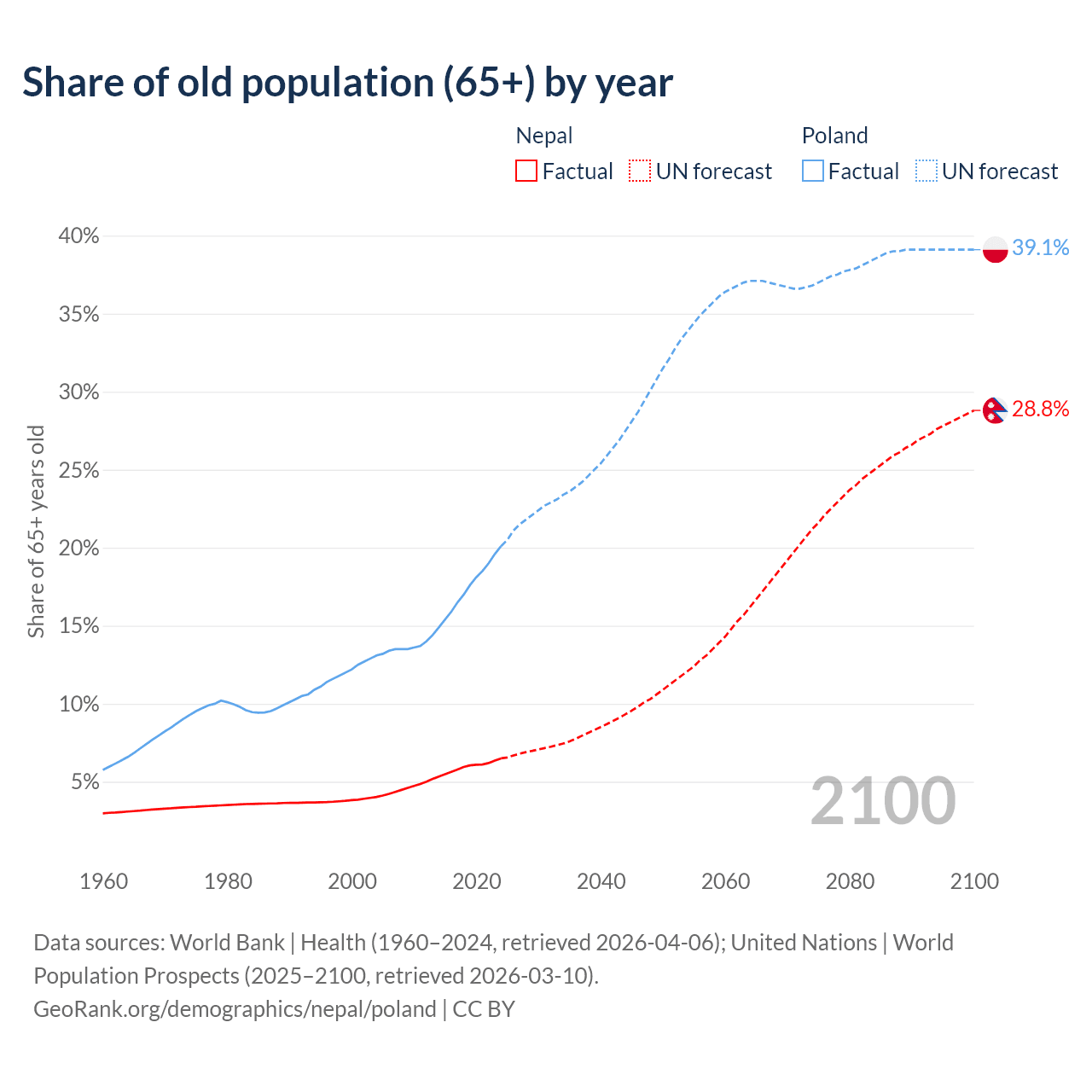 The share of older people aged 65 and over is 6.5% in Nepal and 20.1% in Poland. Life expectancy in Nepal compared to Poland .
