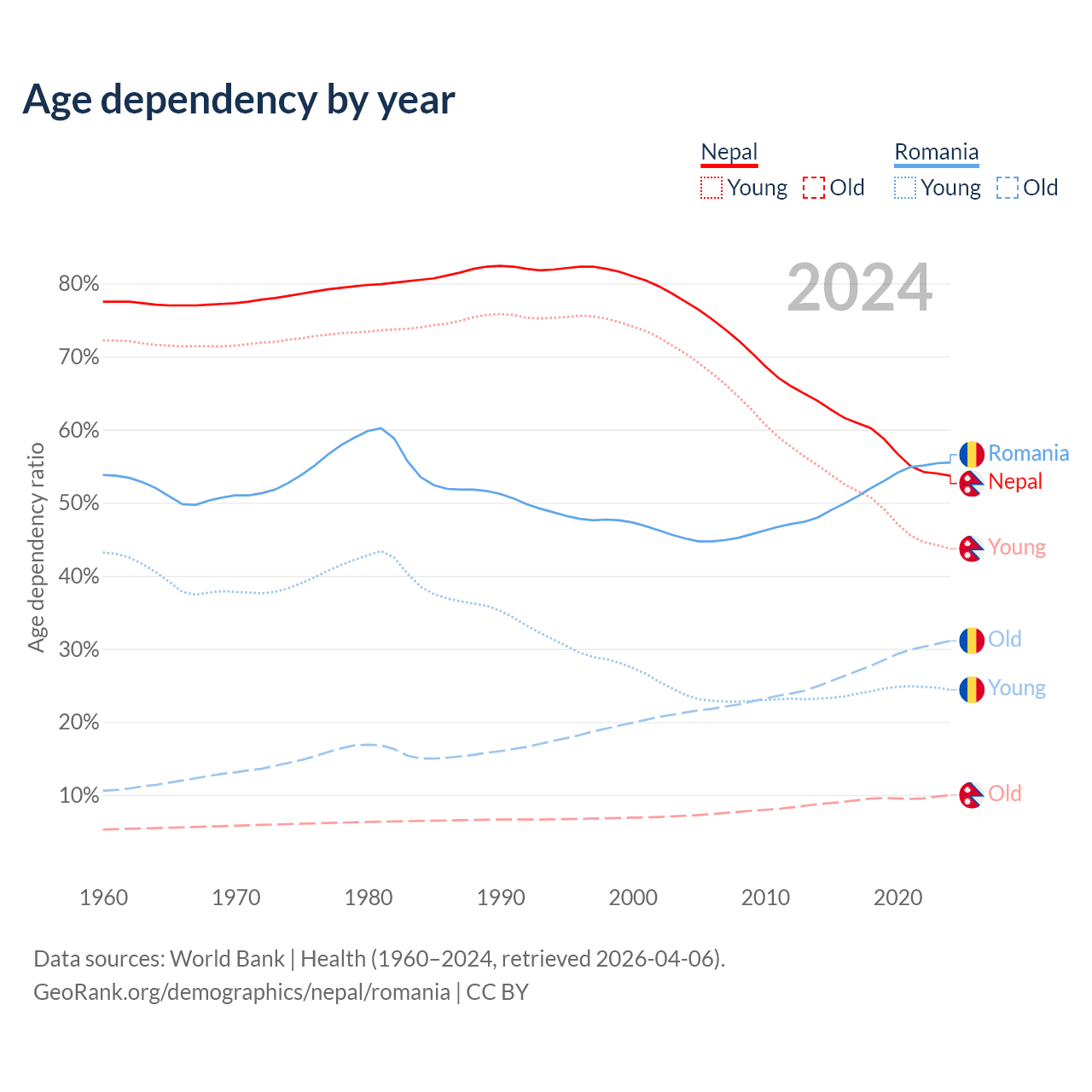 - Nepal is ranked 127/196 by median age (oldest to youngest) vs 23/196 for Romania.