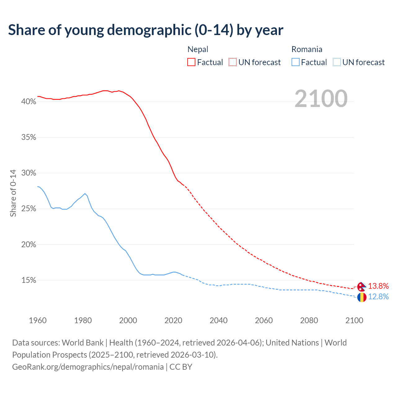 - The share of young demographic (0-15 years old) in Nepal is 28.4% vs 15.7% in Romania.