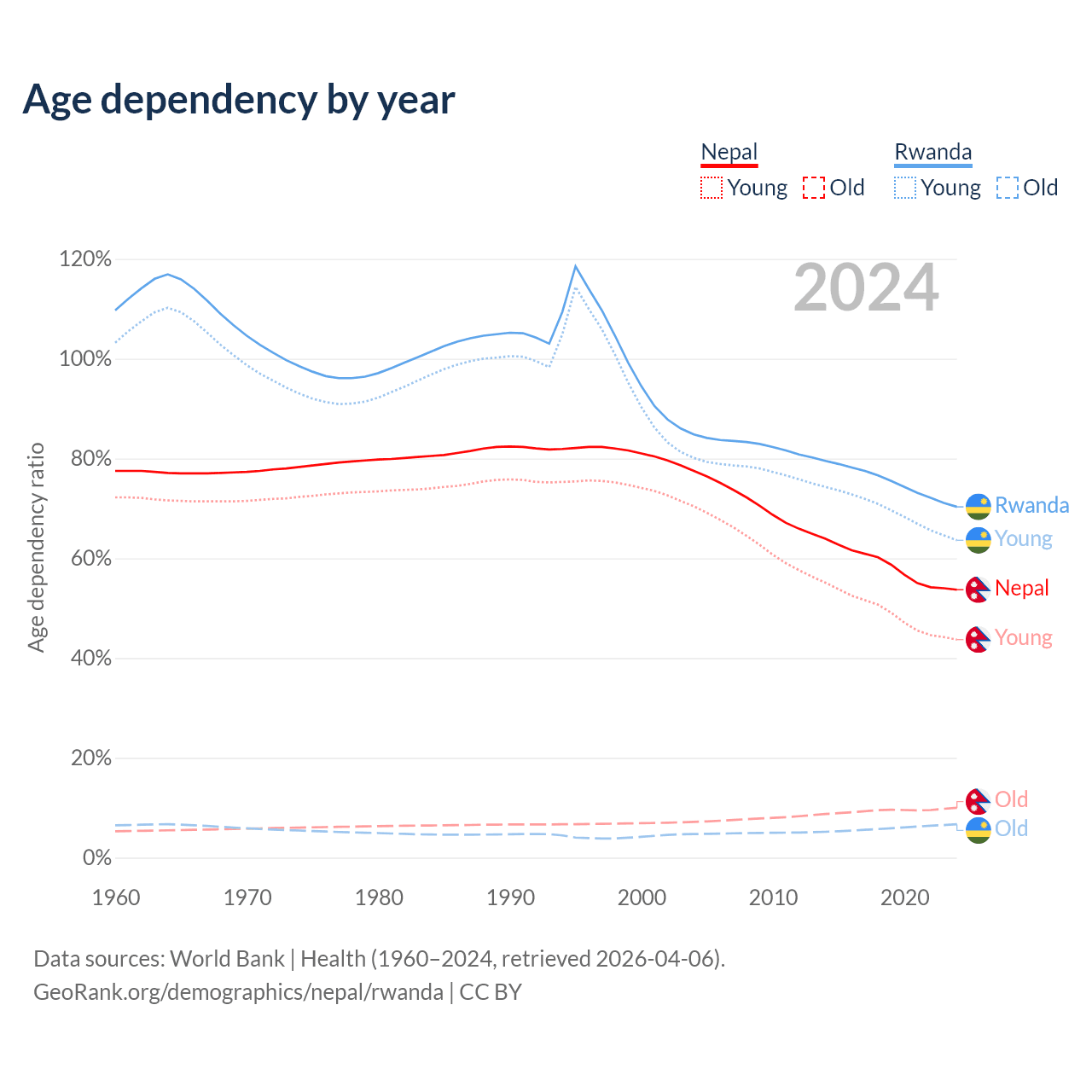- Nepal is ranked 127/196 by median age (oldest to youngest) vs 160/196 for Rwanda.