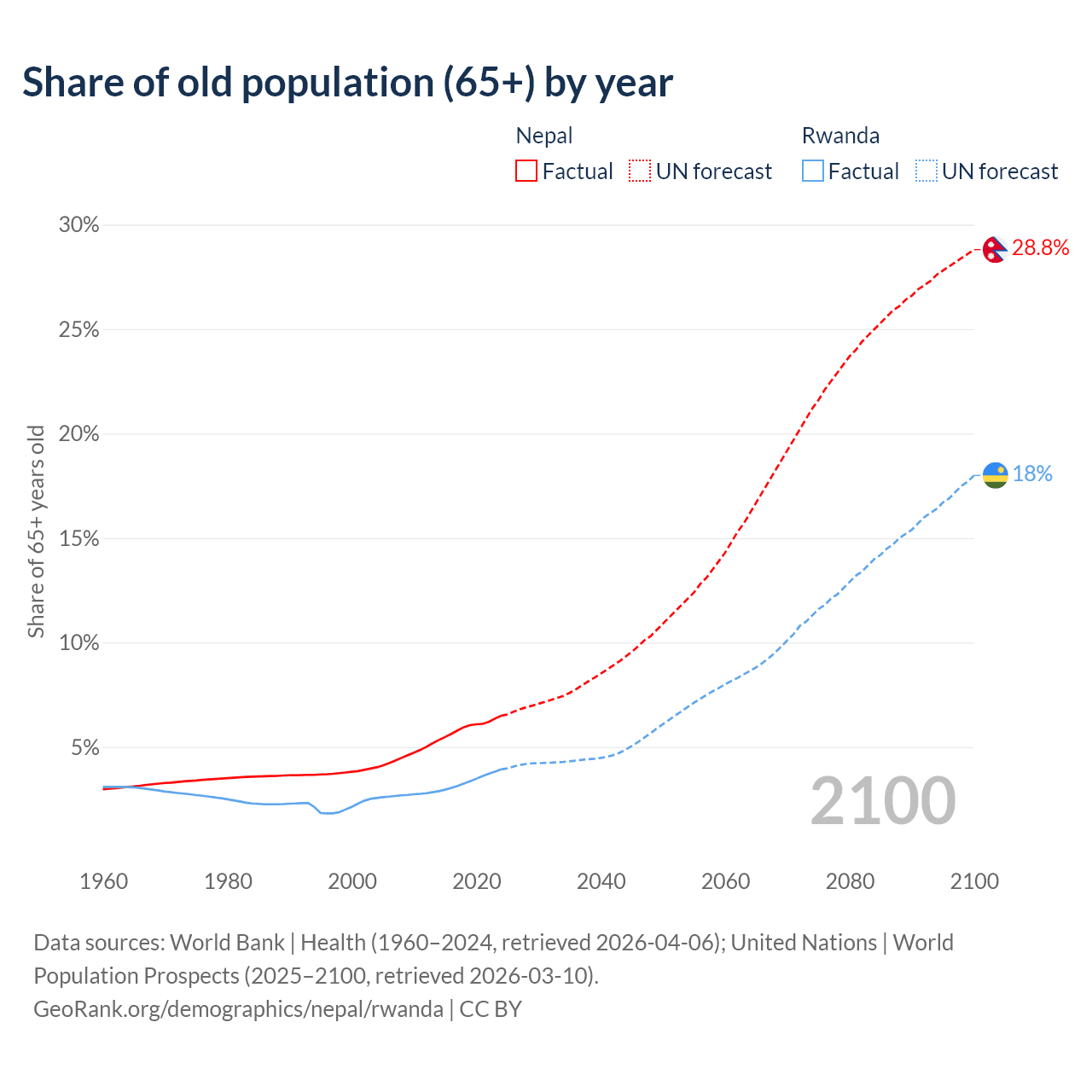 The share of older people aged 65 and over is 6.5% in Nepal and 3.93% in Rwanda. Life expectancy in Nepal compared to Rwanda .