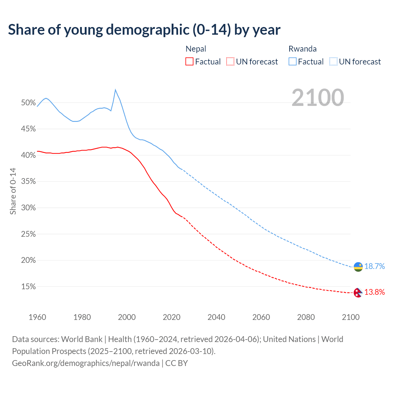 - The share of young demographic (0-15 years old) in Nepal is 28.4% vs 37.4% in Rwanda.