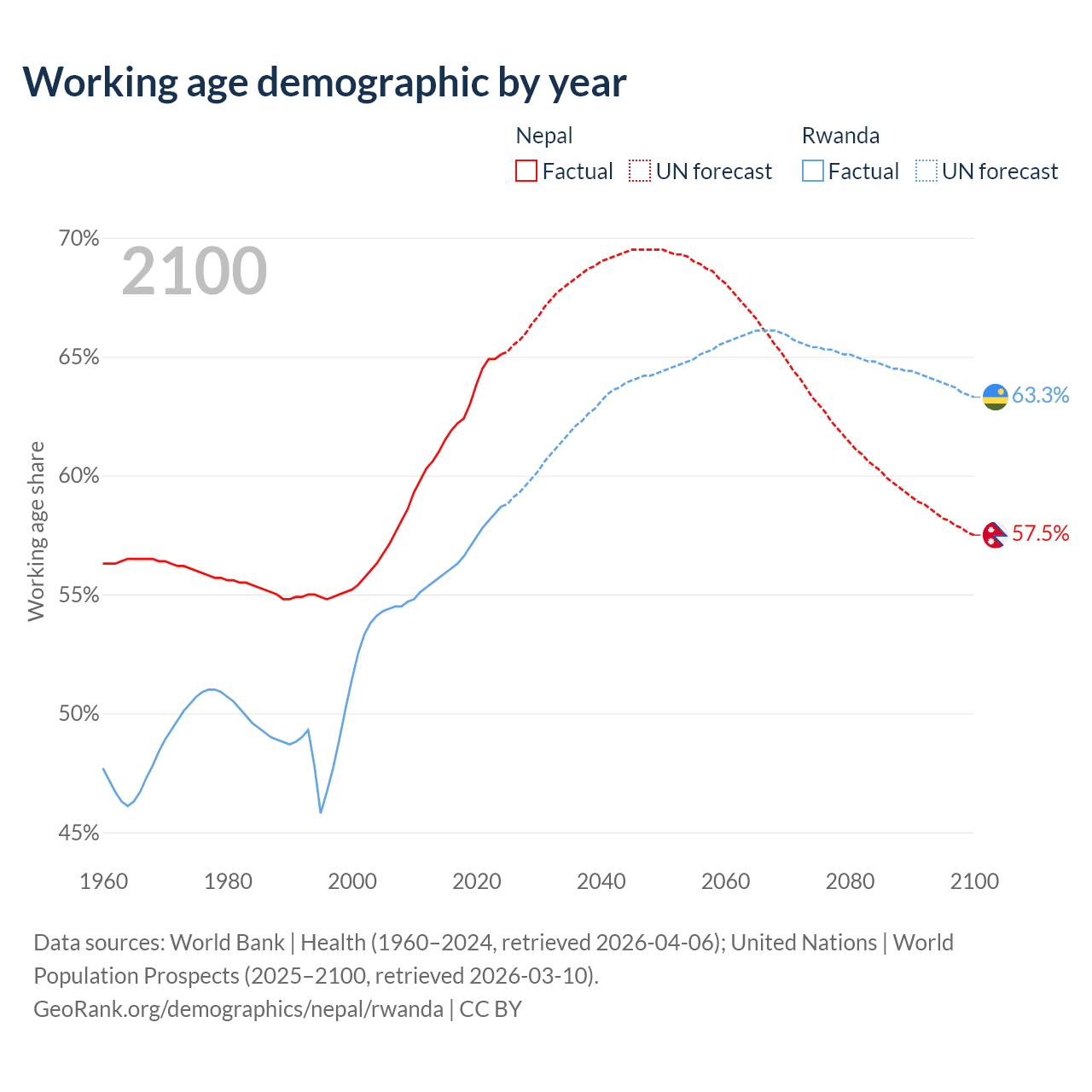 - Nepal has 19.3M working age adults (aged 15-64) vs 8.79M in Rwanda.