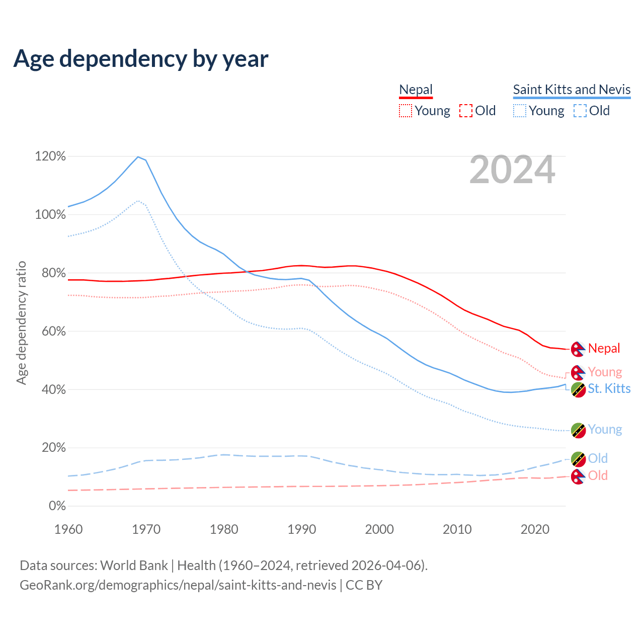 - Nepal is ranked 127/196 by median age (oldest to youngest) vs 69/196 for Saint Kitts and Nevis.