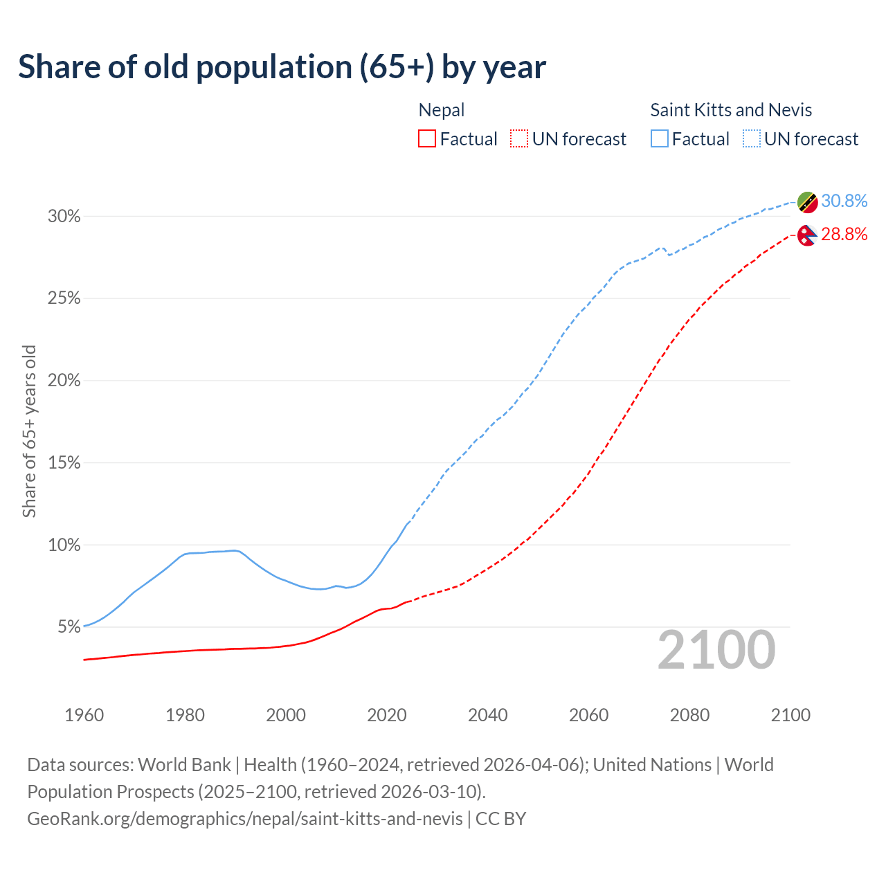 The share of older people aged 65 and over is 6.5% in Nepal and 11.2% in Saint Kitts and Nevis. Life expectancy in Nepal compared to Saint Kitts and Nevis .