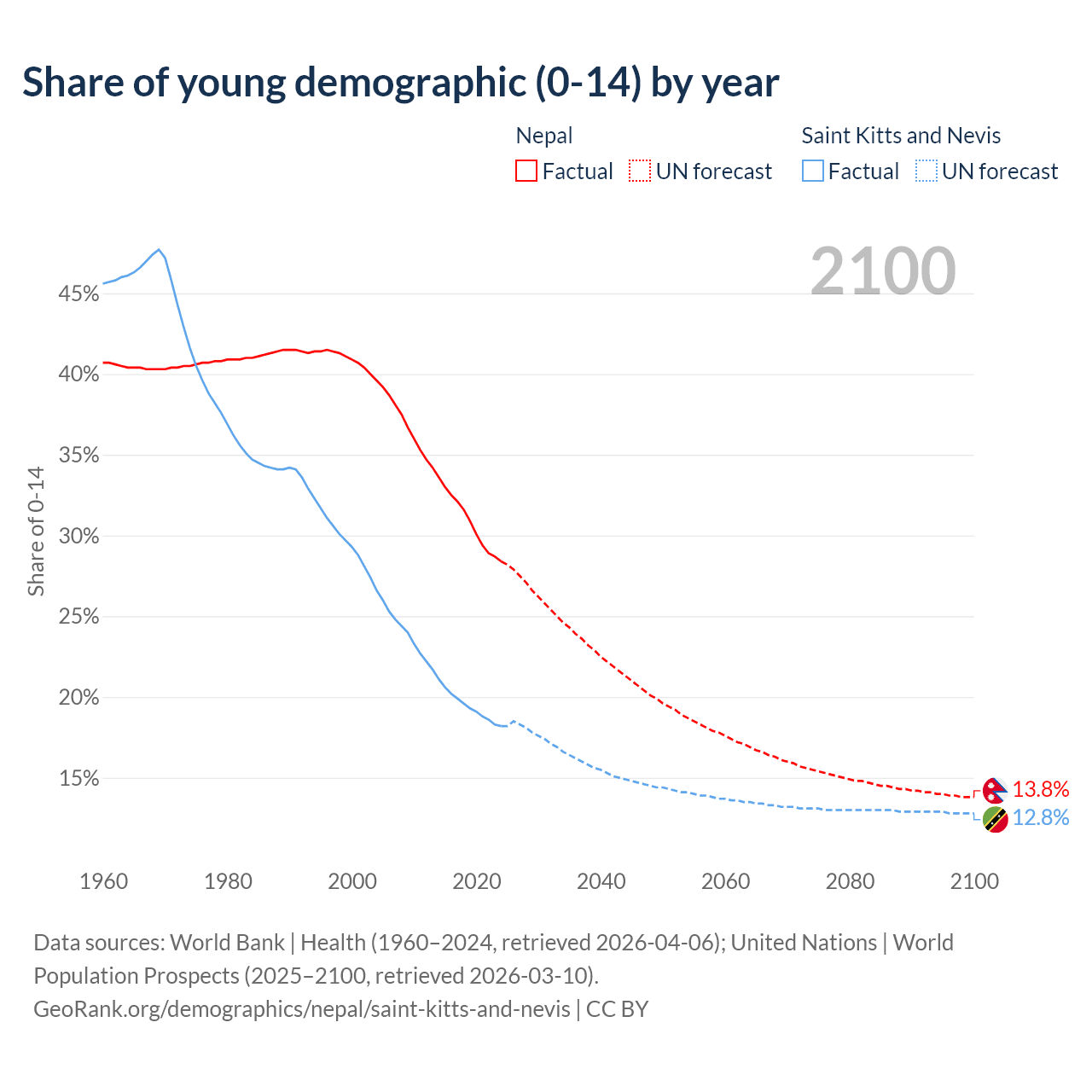 - The share of young demographic (0-15 years old) in Nepal is 28.4% vs 18.2% in Saint Kitts and Nevis.