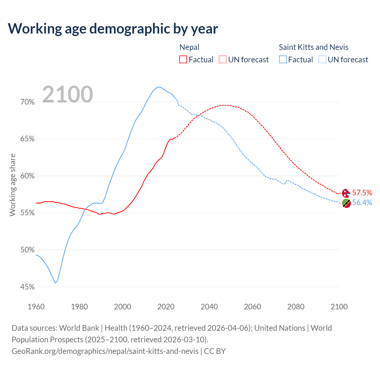 - Nepal has 19.3M working age adults (aged 15-64) vs 33.2K in Saint Kitts and Nevis.