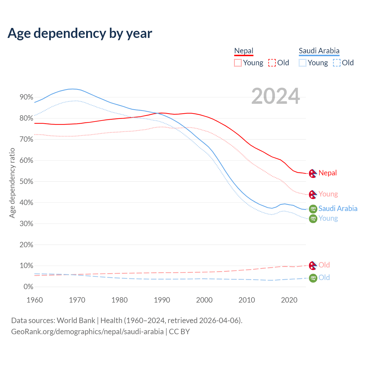 - Nepal is ranked 127/196 by median age (oldest to youngest) vs 98/196 for Saudi Arabia.