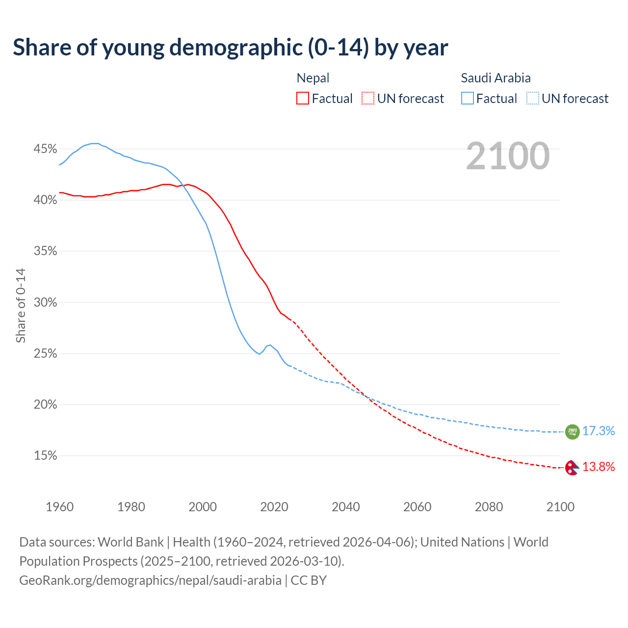 - The share of young demographic (0-15 years old) in Nepal is 28.4% vs 23.8% in Saudi Arabia.