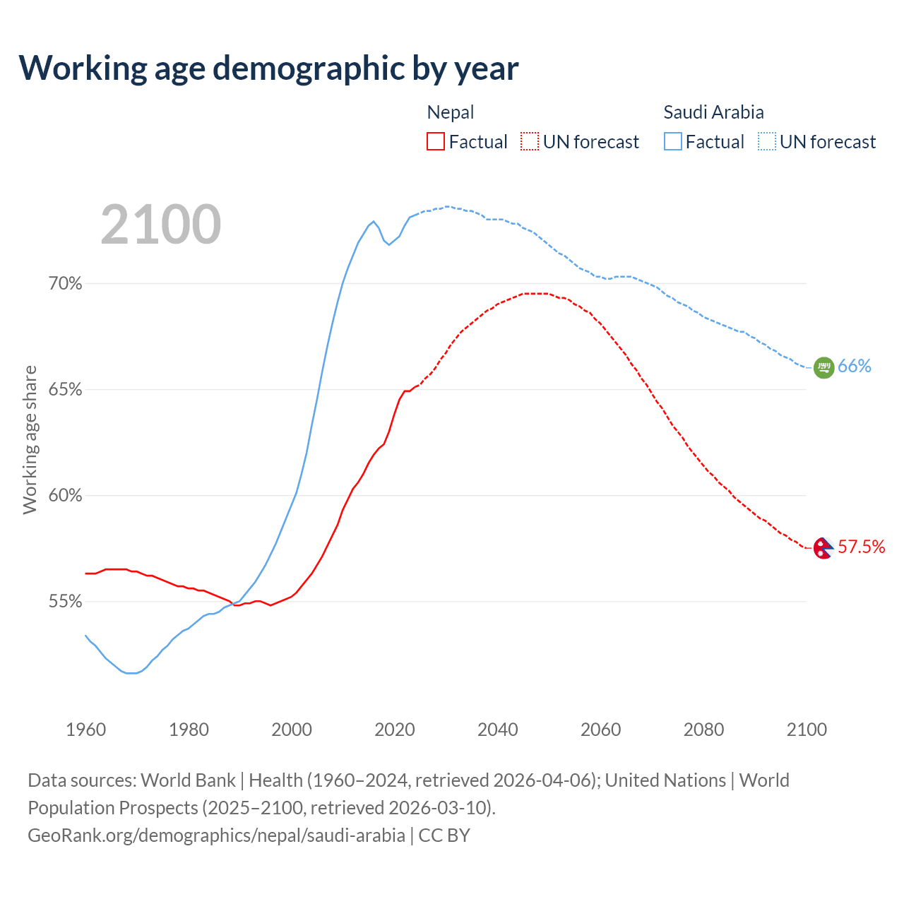 - Nepal has 19.3M working age adults (aged 15-64) vs 26.9M in Saudi Arabia.