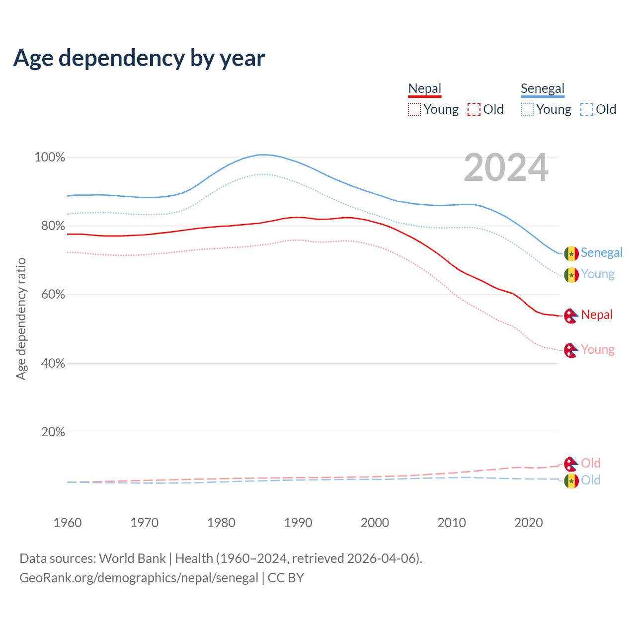 Data sources: World Bank | Health (1960–2024, retrieved 2026-04-06); U.S. Census Bureau (1960–2024, retrieved 2026-02-08).