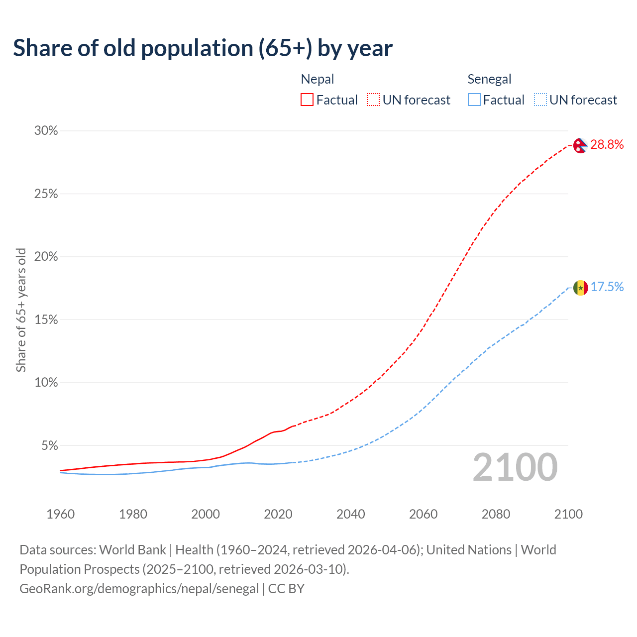 The share of older people aged 65 and over is 6.5% in Nepal and 3.62% in Senegal. Life expectancy in Nepal compared to Senegal .
