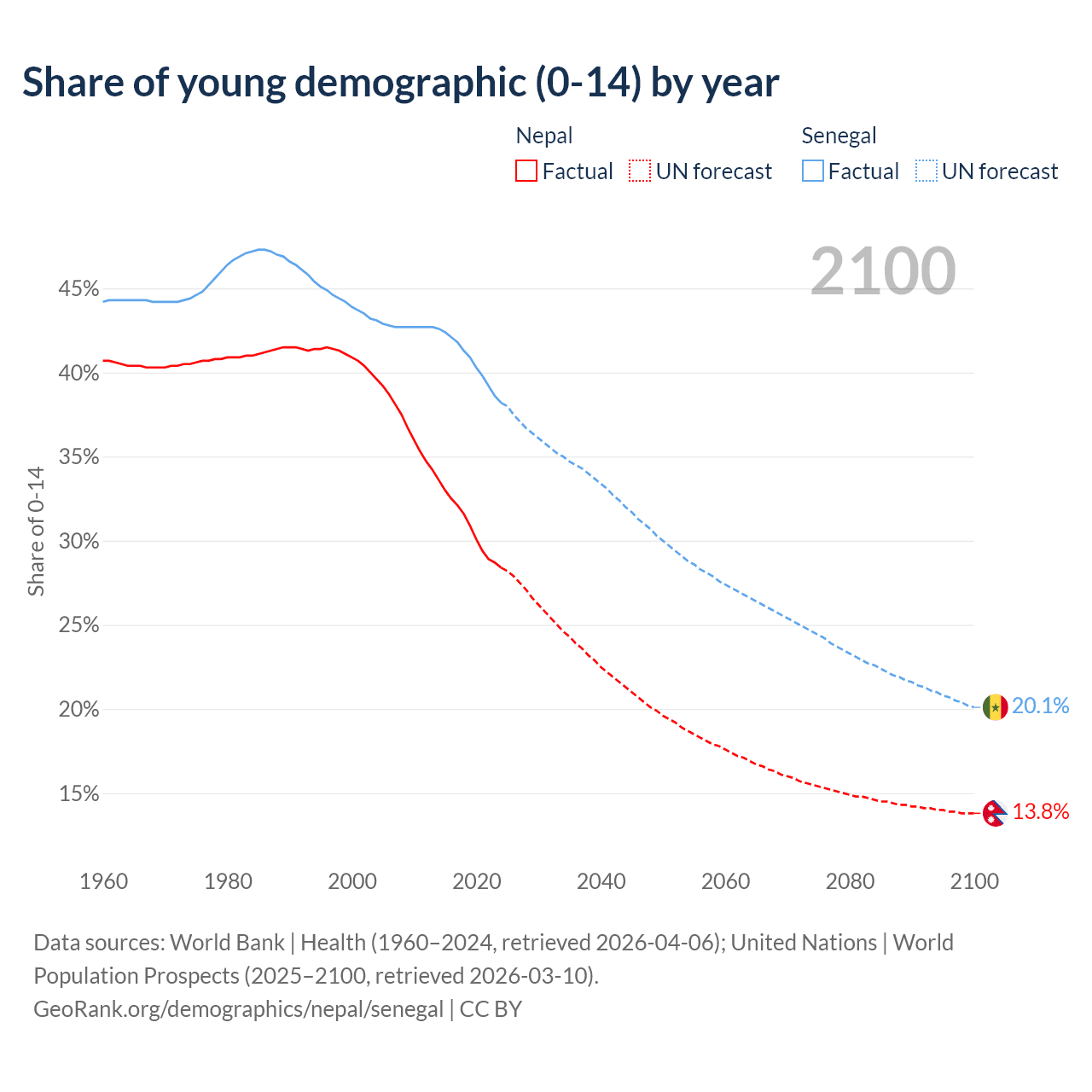 - The share of young demographic (0-15 years old) in Nepal is 28.4% vs 38.2% in Senegal.