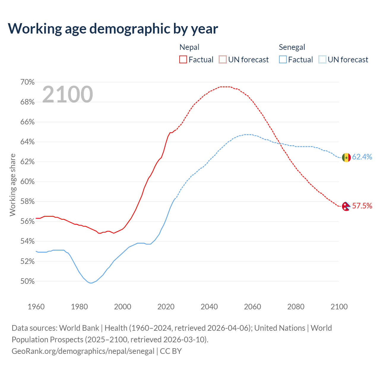 Median age Nepal vs Senegal, 1960-2100