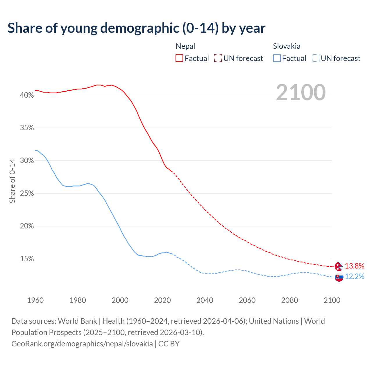 - The share of young demographic (0-15 years old) in Nepal is 28.4% vs 15.8% in Slovakia.