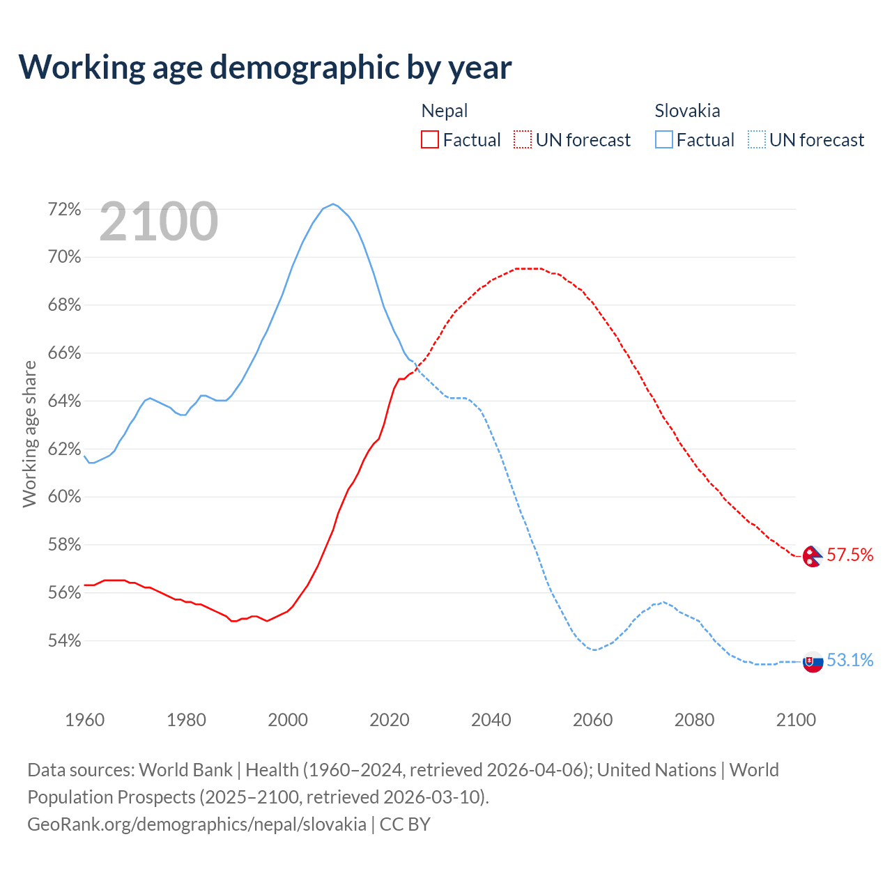 The share of older people aged 65 and over is 6.5% in Nepal and 18.5% in Slovakia. Life expectancy in Nepal compared to Slovakia .