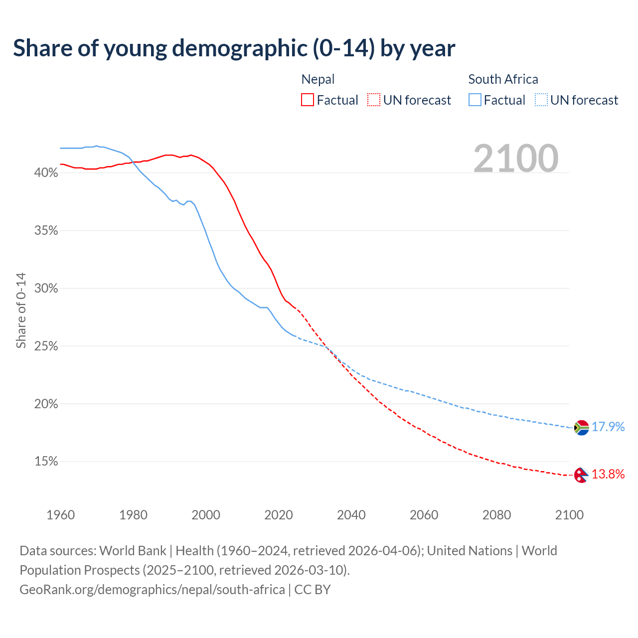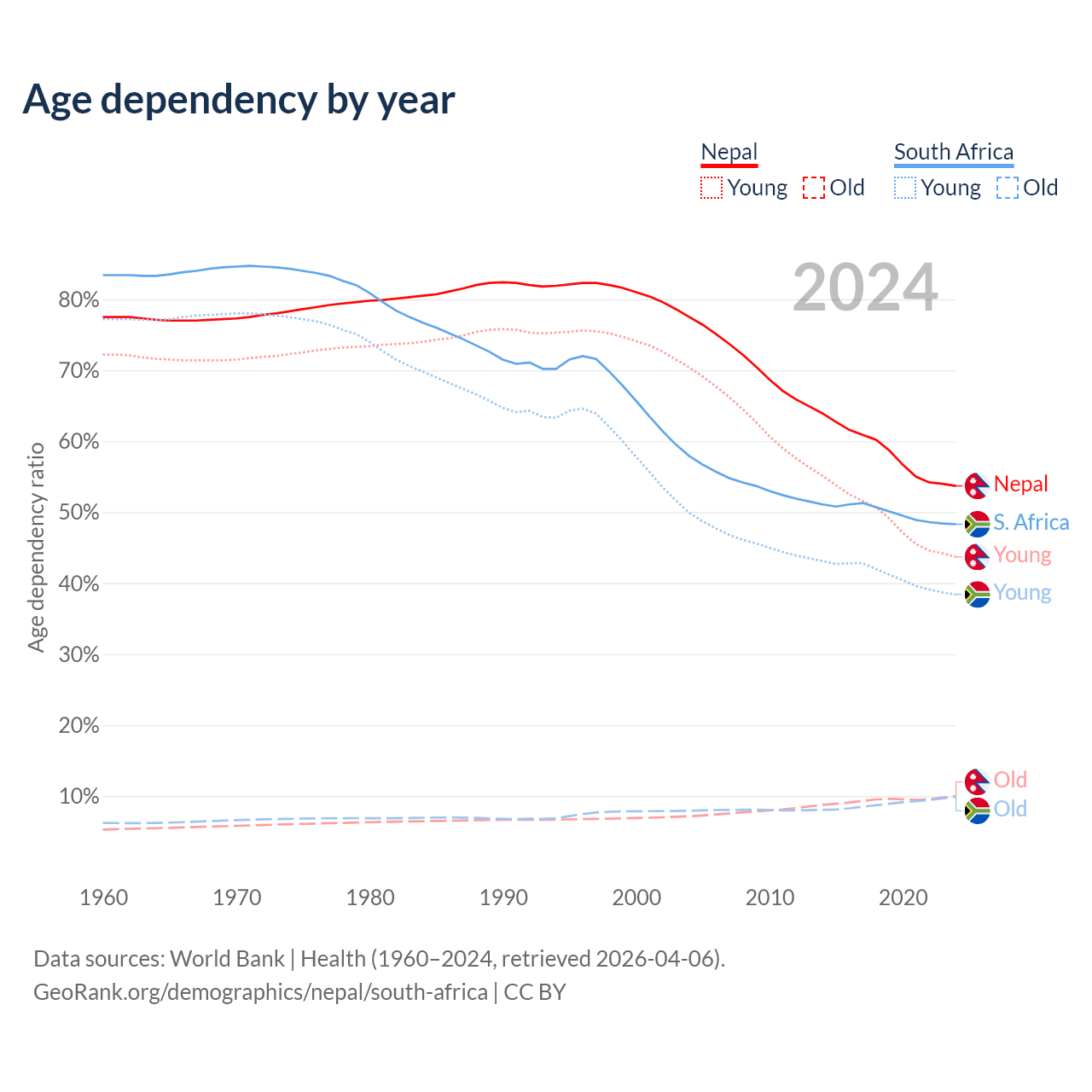 - Nepal is ranked 127/196 by median age (oldest to youngest) vs 107/196 for South Africa.