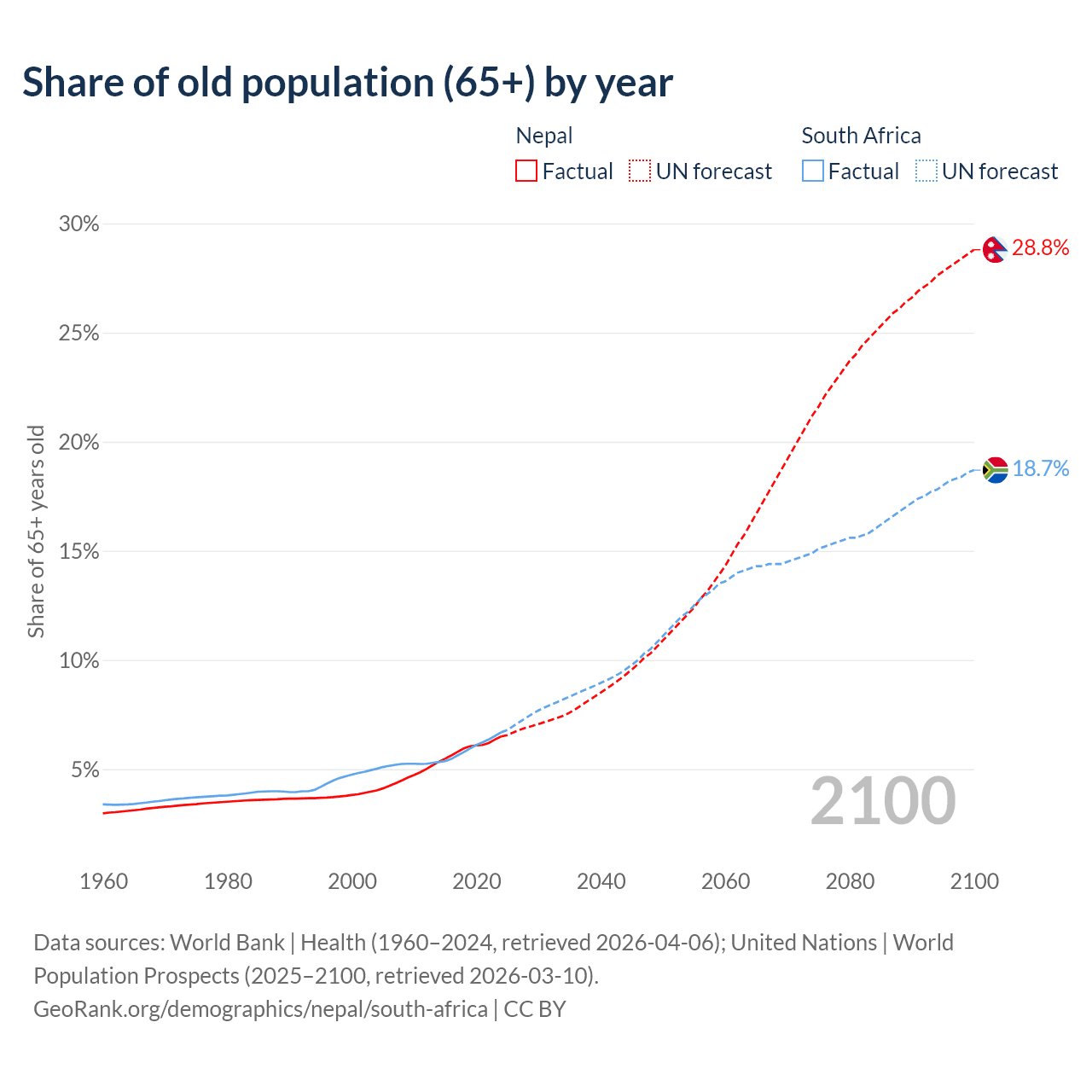 The share of older people aged 65 and over is 6.5% in Nepal and 6.69% in South Africa. Life expectancy in Nepal compared to South Africa .