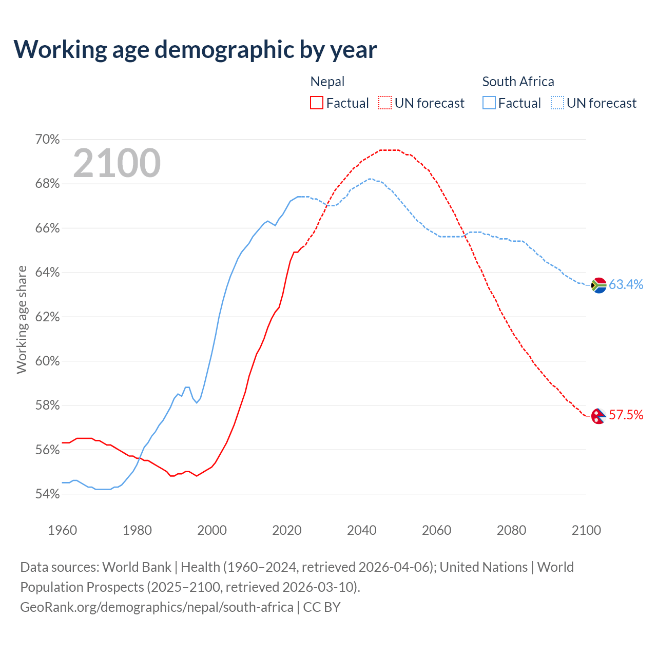 - Nepal has 19.3M working age adults (aged 15-64) vs 44.3M in South Africa.