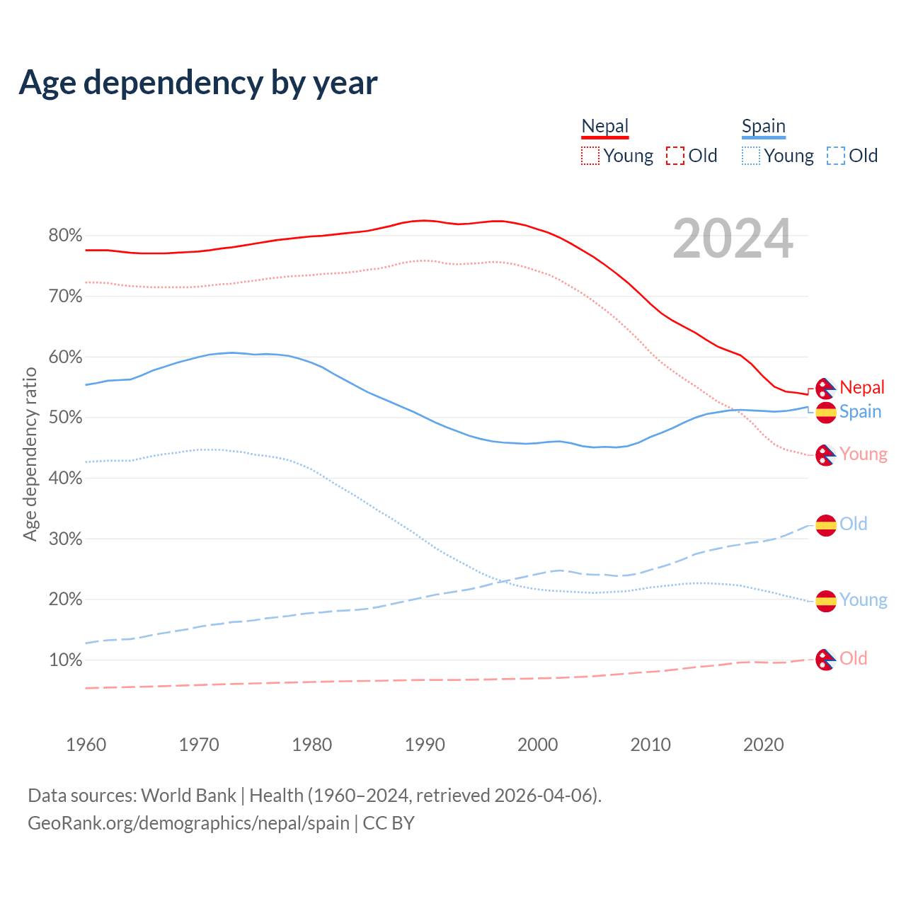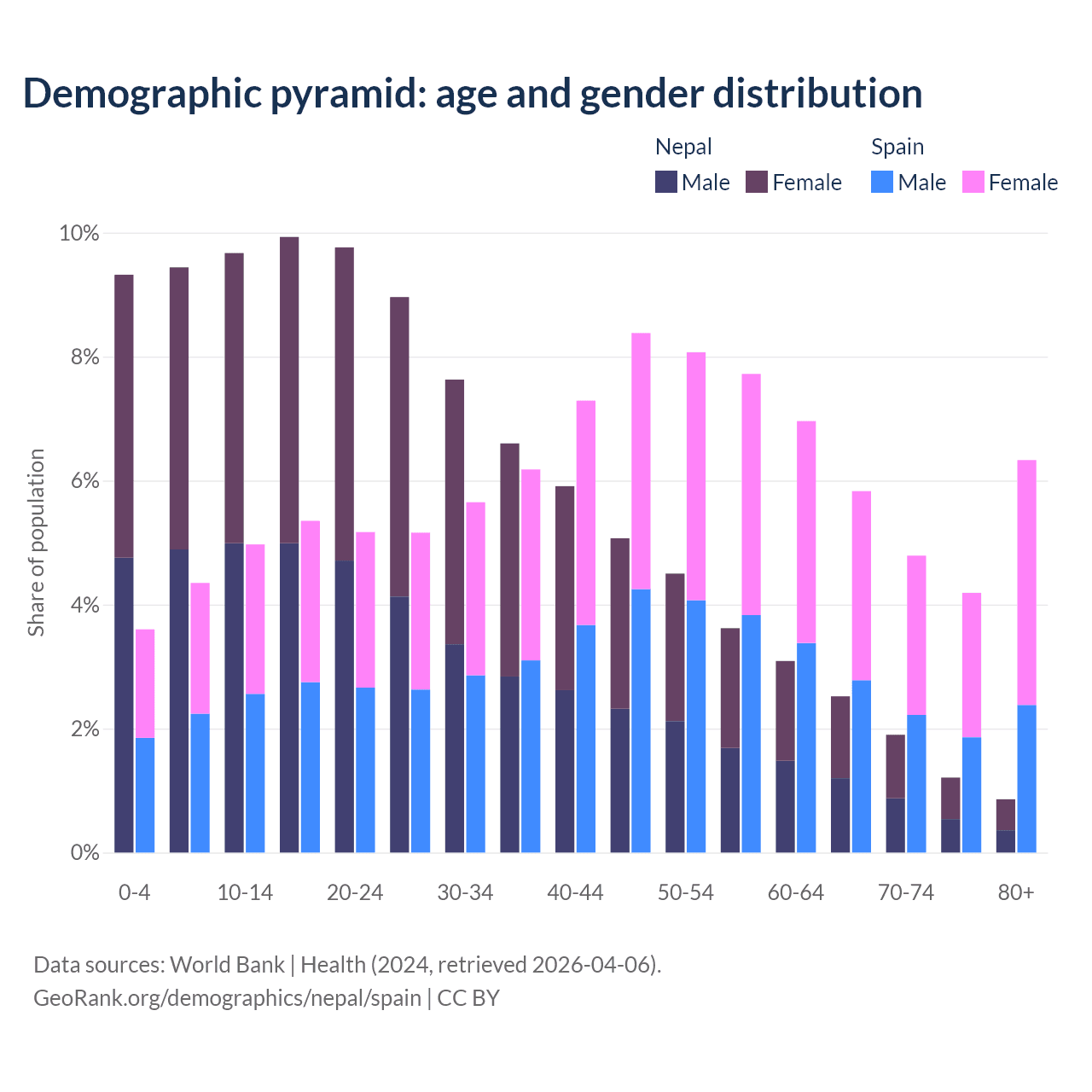 - Nepal is ranked 127/196 by median age (oldest to youngest) vs 7/196 for Spain.