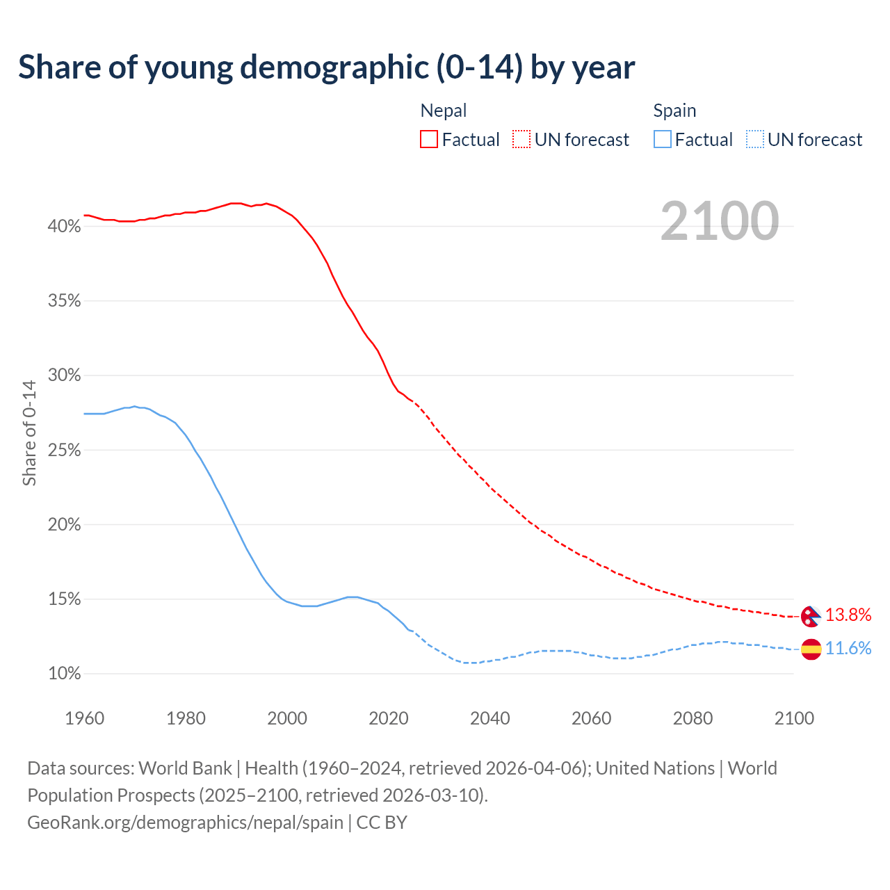 - The share of young demographic (0-15 years old) in Nepal is 28.4% vs 12.9% in Spain.