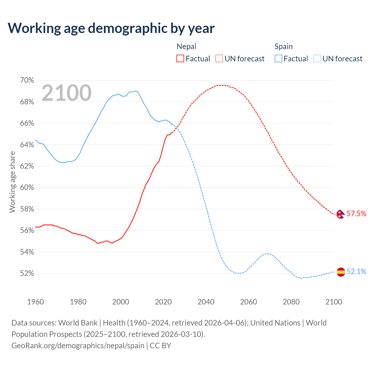 - Nepal has 19.3M working age adults (aged 15-64) vs 32.2M in Spain.