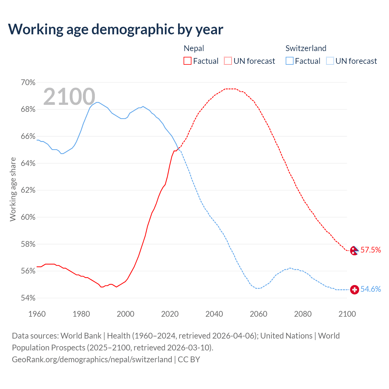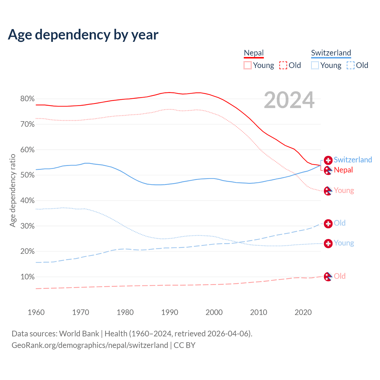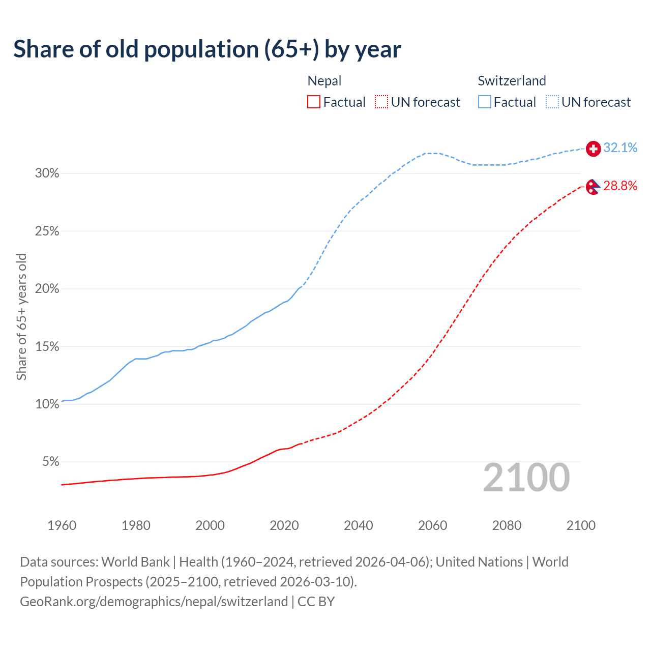 The share of older people aged 65 and over is 6.5% in Nepal and 20% in Switzerland. Life expectancy in Nepal compared to Switzerland .