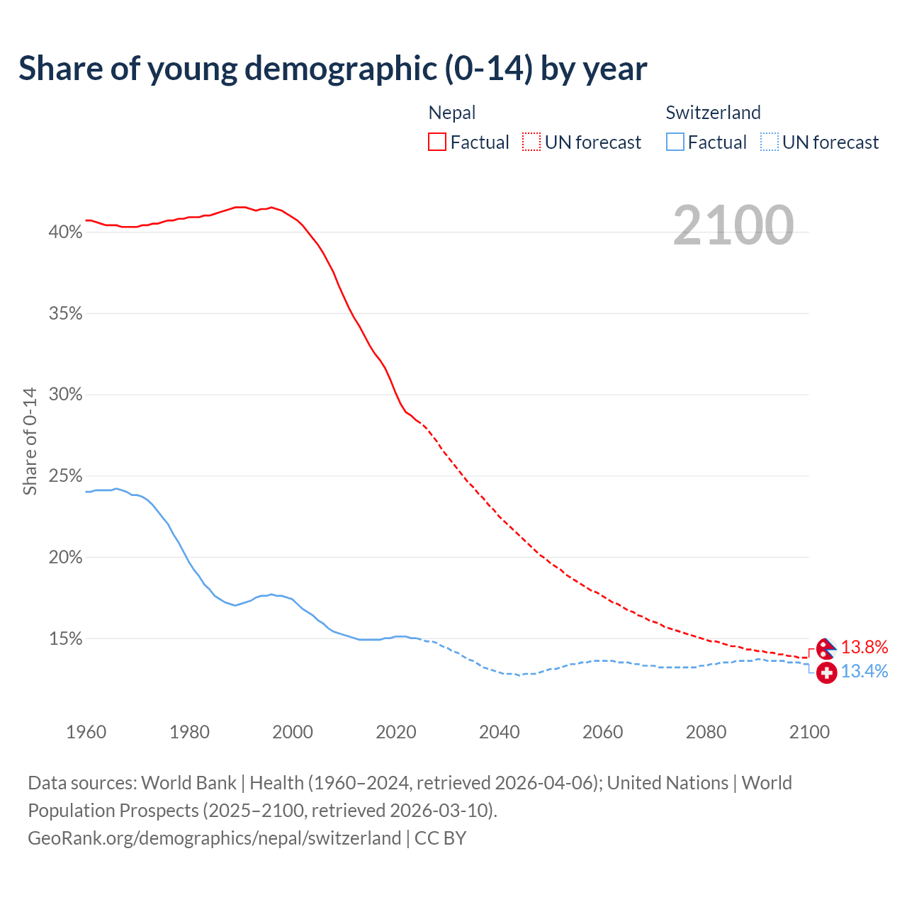- The share of young demographic (0-15 years old) in Nepal is 28.4% vs 15% in Switzerland.
