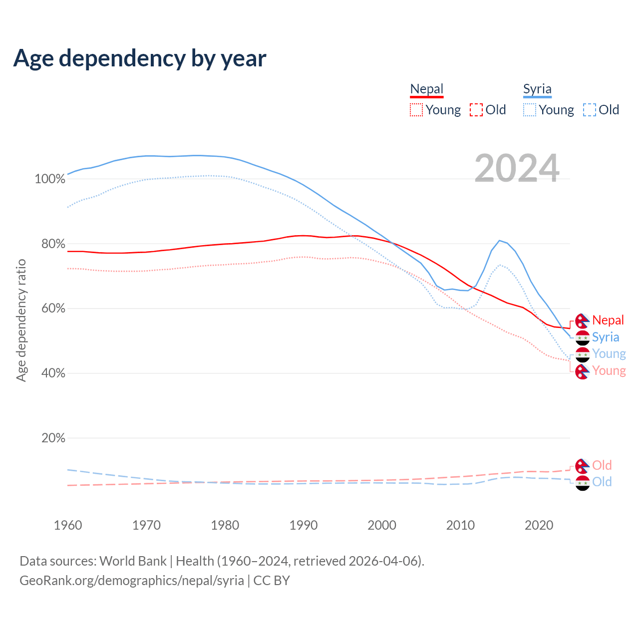 - The share of old-age demographic (65+) in Nepal is 6.5% vs 4.74% in Syria.