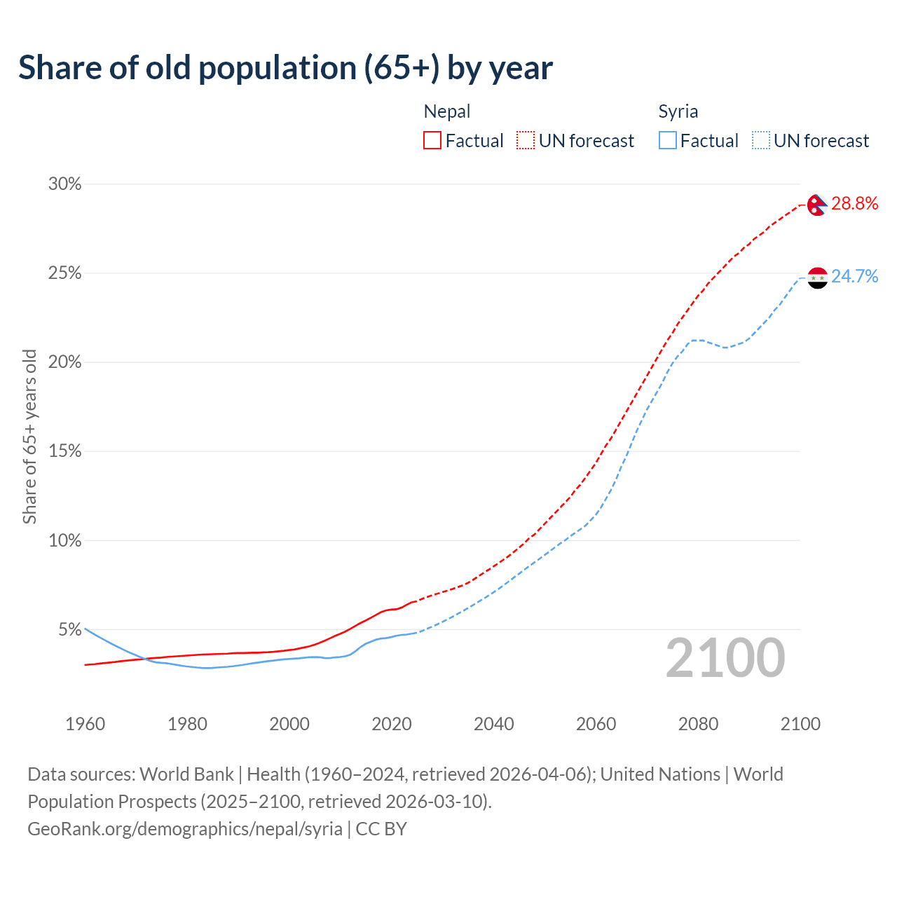 The share of older people aged 65 and over is 6.5% in Nepal and 4.74% in Syria. Life expectancy in Nepal compared to Syria .