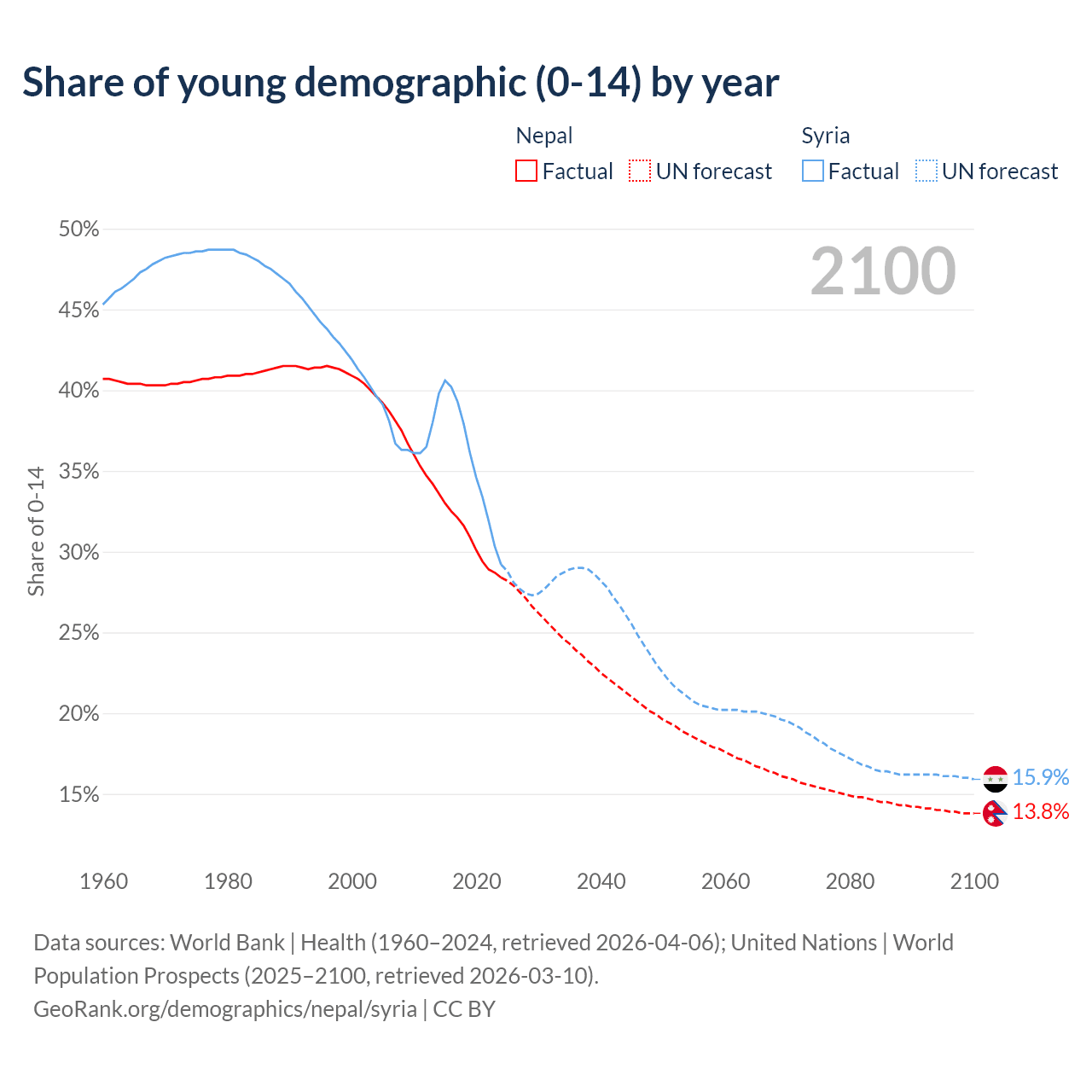 - The share of young demographic (0-15 years old) in Nepal is 28.4% vs 29.2% in Syria.