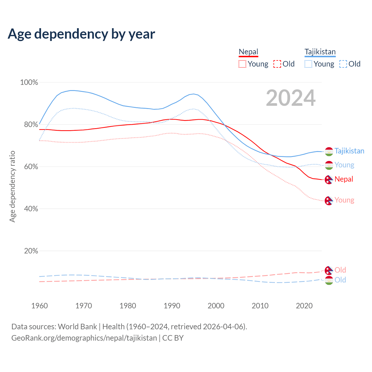 - Nepal is ranked 127/196 by median age (oldest to youngest) vs 142/196 for Tajikistan.