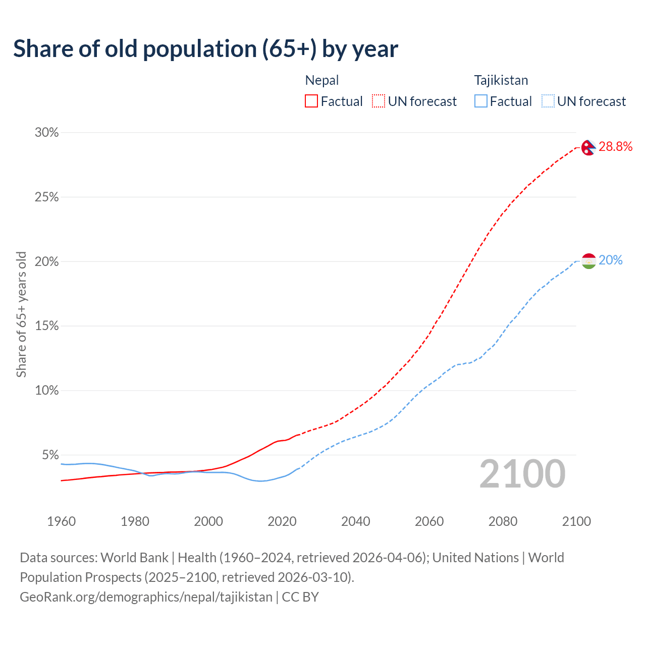 The share of older people aged 65 and over is 6.5% in Nepal and 3.85% in Tajikistan. Life expectancy in Nepal compared to Tajikistan .