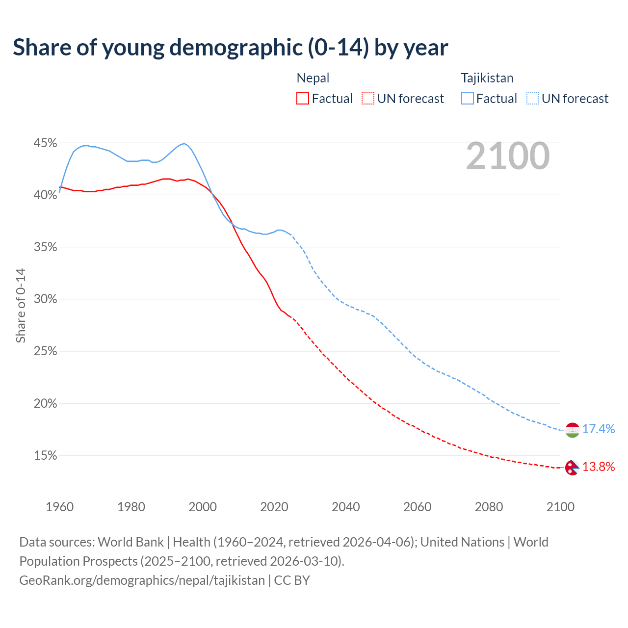 - The share of young demographic (0-15 years old) in Nepal is 28.4% vs 36.3% in Tajikistan.