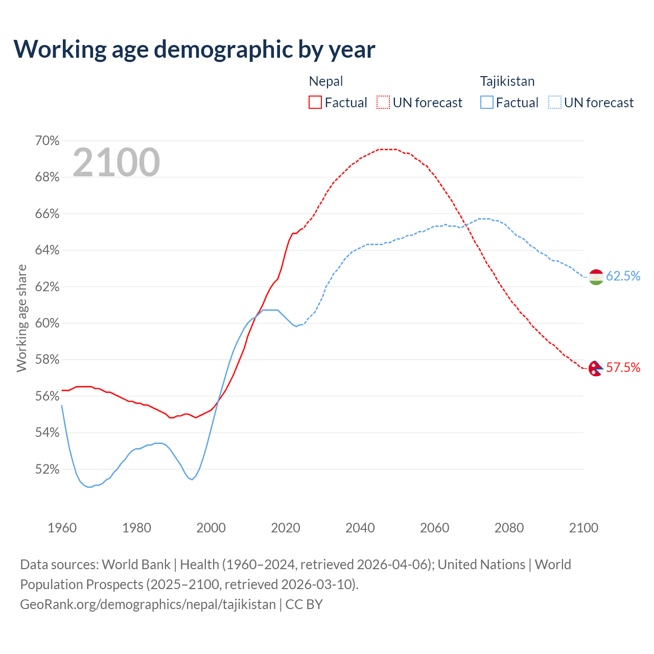 - Nepal has 19.3M working age adults (aged 15-64) vs 6.61M in Tajikistan.